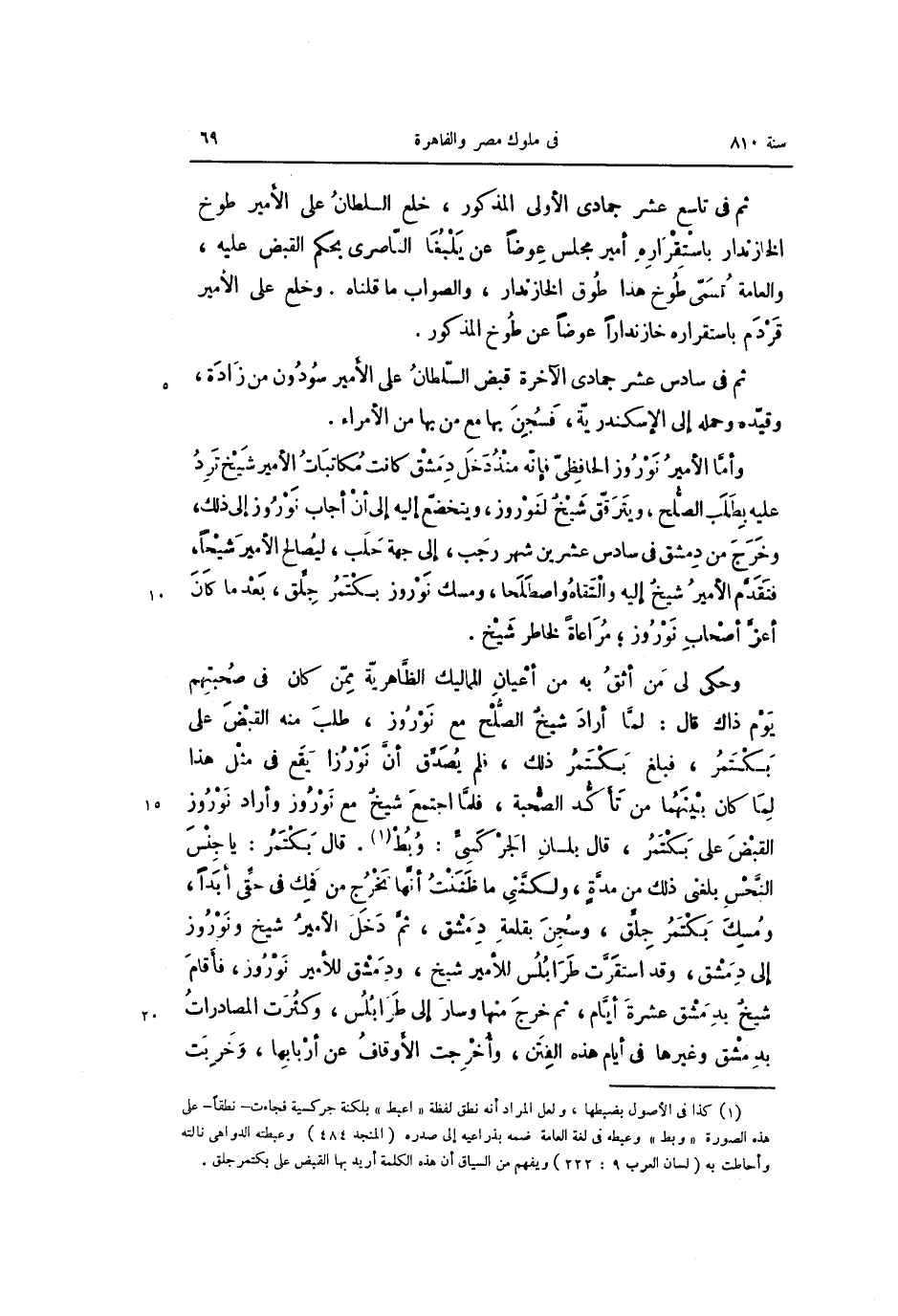وحكى لى من أثق به من أعيان المماليك الظّاهريّة ممّن كان فى صحبتهم يوم ذاك قال: لمّا أراد شيخ الصّلح مع نوروز، طلب منه القبض على بكتمر، فبلغ بكتمر ذلك، فلم يصدّق أنّ نوروزا يقع فى مثل هذا لما كان بينهما من تأكّد الصّحبة، فلمّا اجتمع شيخ مع نوروز وأراد نوروز القبض على بكتمر، قال بلسان الجركسىّ: وبط «1» . قال بكتمر: يا جنس النّحس بلغنى ذلك من مدّة، ولكنّنى ما ظننت أنّها تخرج من فمك فى حقّى أبدا، ومسك بكتمر جلّق، وسجن بقلعة دمشق، ثمّ دخل الأمير شيخ ونوروز إلى دمشق، وقد استقرّت طرابلس للأمير شيخ، ودمشق للأمير نوروز، فأقام شيخ بدمشق عشرة أيّام، ثم خرج منها وسار إلى طرابلس، وكثرت المصادرات بدمشق وغيرها فى أيام هذه الفتن، وأخرجت الأوقاف عن أربابها، وخربت