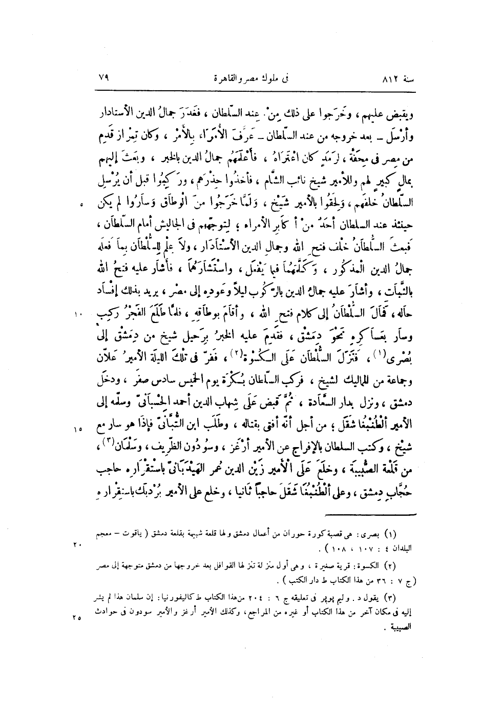 ويقبض عليهم، وخرجوا على ذلك من عند السّلطان، فغدر جمال الدين الأستادار وأرسل- بعد خروجه من عند السّلطان- عرّف الأمراء بالأمر، وكان تمراز قدم من مصر فى محفّة، لرمد كان اعتراه، فأعلمهم جمال الدين بالخبر، وبعث إليهم بمال كبير لهم وللأمير شيخ نائب الشّام، فأخذوا حذرهم، وركبوا قبل أن يرسل السّلطان خلفهم، ولحقوا بالأمير شيخ، ولمّا خرجوا من الوطاق وساروا لم يكن حينئذ عند السلطان أحد من أكابر الأمراء؛ لتوجّههم فى الجاليش أمام السّلطان، فبعث السّلطان خلف فتح الله وجمال الدين الأستادار، ولا علم للسّلطان بما فعله جمال الدين المذكور، وكلّمهما فيما يفعل، واستشارهما، فأشار عليه فتح الله بالثّبات، وأشار عليه جمال الدين بالرّكوب ليلا وعوده إلى مصر، يريد بذلك إفساد حاله، فمال السّلطان إلى كلام فتح الله، وأقام بوطاقه، فلمّا طلع الفجر ركب وسار بعساكره نحو دمشق، فقدم عليه الخبر برحيل شيخ من دمشق إلى بصرى «1» ، فنزل السّلطان على الكسوة «2» ، ففرّ فى تلك الليلة الأمير علّان وجماعة من المماليك لشيخ، فركب السّلطان بكرة يوم الخميس سادس صفر، ودخل دمشق، ونزل بدار السّعادة، ثمّ قبض على شهاب الدين أحمد الحسبانىّ وسلّمه إلى الأمير ألطنبغا شقل؛ من أجل أنّه أفتى بقتاله، وطلب ابن التّبّانىّ فإذا هو سار مع شيخ، وكتب السلطان بالإفراج عن الأمير أرغز، وسودون الظّريف، وسلمان «3» ، من قلعة الصّبيبة، وخلع على الأمير زين الدين عمر الهيدبانىّ باستقراره حاجب حجّاب دمشق، وعلى ألطنبغا شقل حاجبا ثانيا، وخلع على الأمير بردبك باستقراره