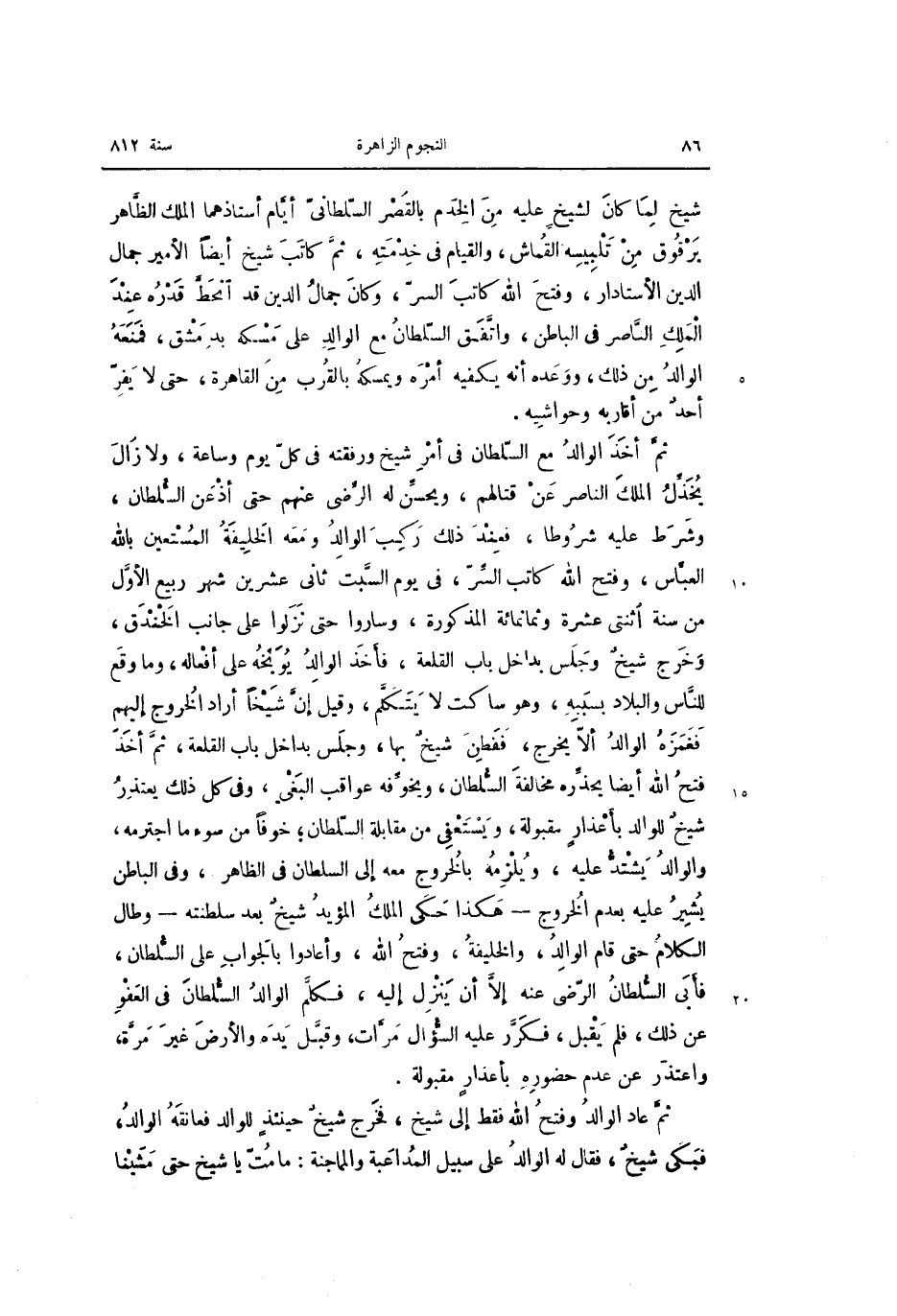 شيخ لما كان لشيخ عليه من الخدم بالقصر السّلطانىّ أيّام أستاذهما الملك الظّاهر برقوق من تلبيسه القماش، والقيام فى خدمته، ثمّ كاتب شيخ أيضا الأمير جمال الدين الأستادار، وفتح الله كاتب السرّ، وكان جمال الدين قد انحطّ قدره عند الملك النّاصر فى الباطن، واتّفق السّلطان مع الوالد على مسكه بدمشق، فمنعه الوالد من ذلك، ووعده أنه يكفيه أمره ويمسكه بالقرب من القاهرة، حتى لا يفرّ أحد من أقاربه وحواشيه.