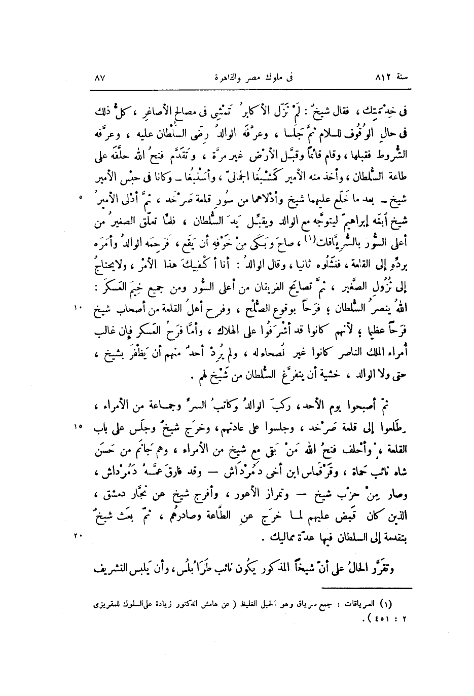 فى خدمتك، فقال شيخ: لم تزل الأكابر تمشى فى مصالح الأصاغر، كلّ ذلك فى حال الوقوف للسلام ثمّ جلسا، وعرّفه الوالد رضى السّلطان عليه، وعرّفه الشّروط فقبلها، وقام قائما وقبّل الأرض غير مرّة، وتقدّم فتح الله حلّفه على طاعة السّلطان، وأخذ منه الأمير كمشبغا الجمالىّ، وأسنبغا- وكانا فى حبس الأمير شيخ- بعد ما خلع عليهما شيخ وأدلاهما من سور قلعة صرخد، ثمّ أدلى الأمير شيخ أبنه إبراهيم ليتوجّه مع الوالد ويقبّل يد السّلطان، فلمّا تعلّق الصغير من أعلى السّور بالسّريّاقات «1» ، صاح وبكى من خوفه أن يقع، فرحمه الوالد وأمره بردّه إلى القلعة، فنشلوه ثانيا، وقال الوالد: أنا أكفيك هذا الأمر، ولا يحتاج إلى نزول الصّغير، ثمّ تصايح الفريقان من أعلى السّور ومن جمع خيم العسكر: