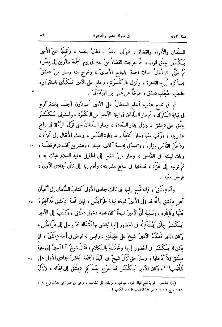 وأمّا دمشق، فإنه قدم إليها فى ثالث جمادى الأولى كتاب السّلطان إلى أعيان أهل دمشق بأنّه قد ولّى الأمير شيخا نيابة طرابلس، فإن قصد دمشق فدافعوه عنها وقاتلوه، وسببه أنّ الأمير شيخا كان قصد دخول دمشق، وكتب إلى الأمير بكتمر جلّق يستأذنه فى الحضور إليها ليقضى بها أشغاله ثمّ يرحل إلى طرابلس، وكان الذي قصده الأمير شيخ على حقيقته، وليس له غرض فى أخذ دمشق، فلم يأذن له بكتمر فى الحضور إليها وخاشنه بالكلام، فقال شيخ أنا أسير إلى جهة دمشق ولا أدخلها، وسار حتى نزل شيخ فى ليلة الجمعة عاشر جمادى الأولى على شقحب «1» ، وكان الأمير بكتمر قد خرج بعساكر دمشق إلى لقائه، ونزل