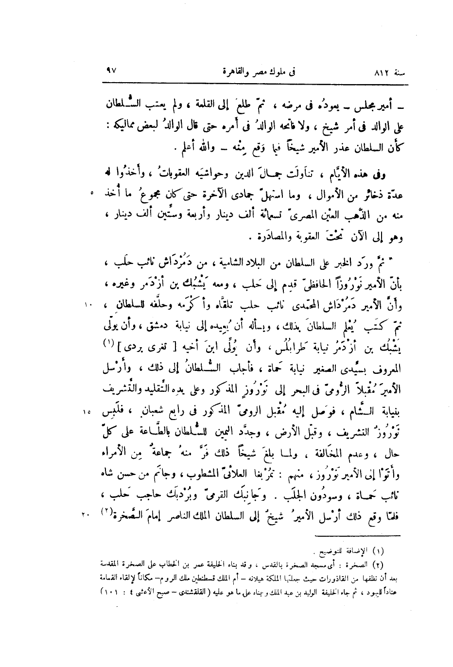 - أمير مجلس- يعوده فى مرضه، ثمّ طلع إلى القلعة، ولم يعتب السّلطان على الوالد فى أمر شيخ، ولا فاتحه الوالد فى أمره حتى قال الوالد لبعض مماليكه: