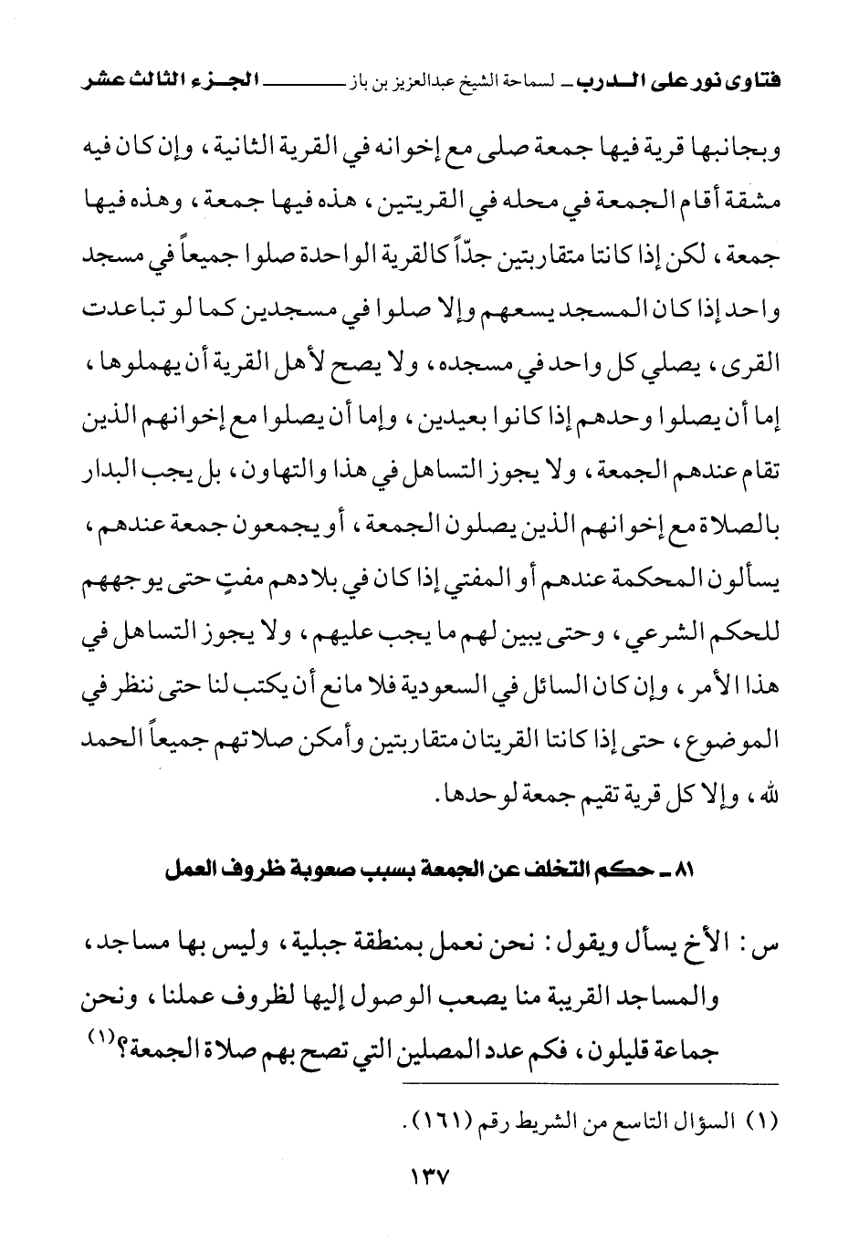 وبجانبها قرية فيها جمعة صلى مع إخوانه في القرية الثانية، وإن كان فيه مشقة أقام الجمعة في محله في القريتين، هذه فيها جمعة، وهذه فيها جمعة، لكن إذا كانتا متقاربتين جدا كالقرية الواحدة صلوا جمعيا في مسجد واحد إذا كان المسجد يسعهم وإلا صلوا في مسجدين كما لو تباعدت القرى يصلي كل واحد في مسجده، ولا يصح لأهل القرية أن يهملوها، إما أن يصلوا وحدهم إذا كانوا بعيدين، وإما أن يصلوا مع إخوانهم الذين تقام عندهم الجمعة، ولا يجوز التساهل في هذا التهاون، بل يجب البدار بالصلاة مع إخوانهم الذين يصلون الجمعة، أو يجمعون جمعة عندهم، يسألون المحكمة عندهم أو المفتي إذا كان في بلادهم مفت حتى يوجههم للحكم الشرعي، وحتى يبين لهم ما يجب عليهم، ولا يجوز التساهل في هذا الأمر، وإن كان السائل في السعودية فلا مانع أن يكتب لنا حتى ننظر في الموضوع، حتى إذا كانتا القريتان متقاربتين وأمكن صلاتهم جميعا الحمد لله، وإلا كل قرية تقيم جمعة لوحدها.