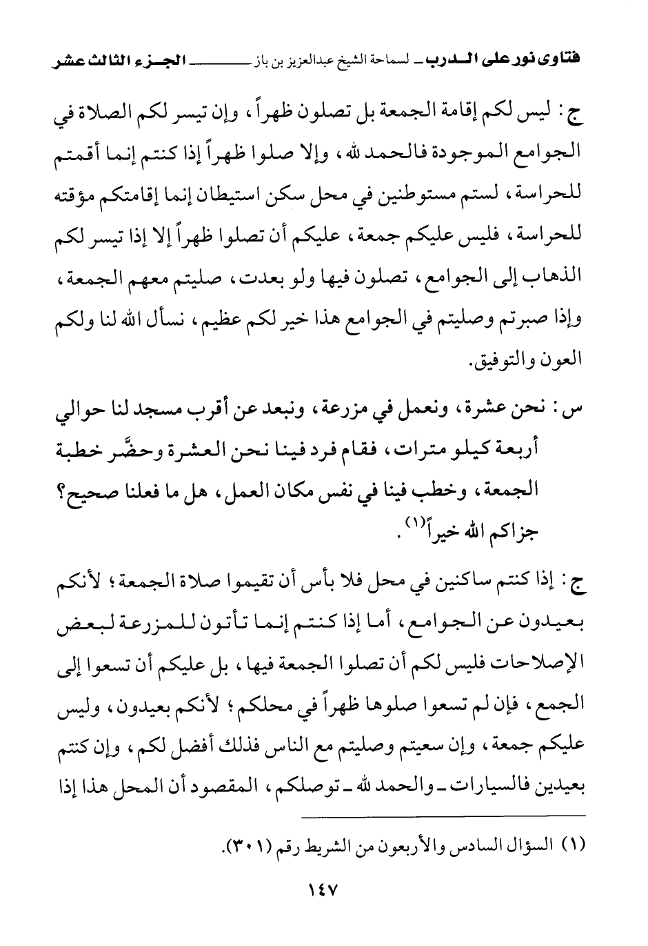 ج: إذا كنتم ساكنين في محل فلا بأس أن تقيموا صلاة الجمعة، لأنكم بعيدون عن الجوامع، أما إذا كنتم إنما تأتون للمزرعة لبعض الإصلاحات فليس لكم أن تصلوا الجمعة فيها، بل عليكم أن تسعوا إلى الجمع، فإن لم تسعوا صلوها ظهرا في محلكم، لأنكم بعيدون، وليس عليكم جمعة، وإن سعيتم وصليتم مع الناس فذلك أفضل لكم. وإن كنتم بعيدين فالسيارات - والحمد لله - توصلكم، المقصود أن المحل هذا إذا