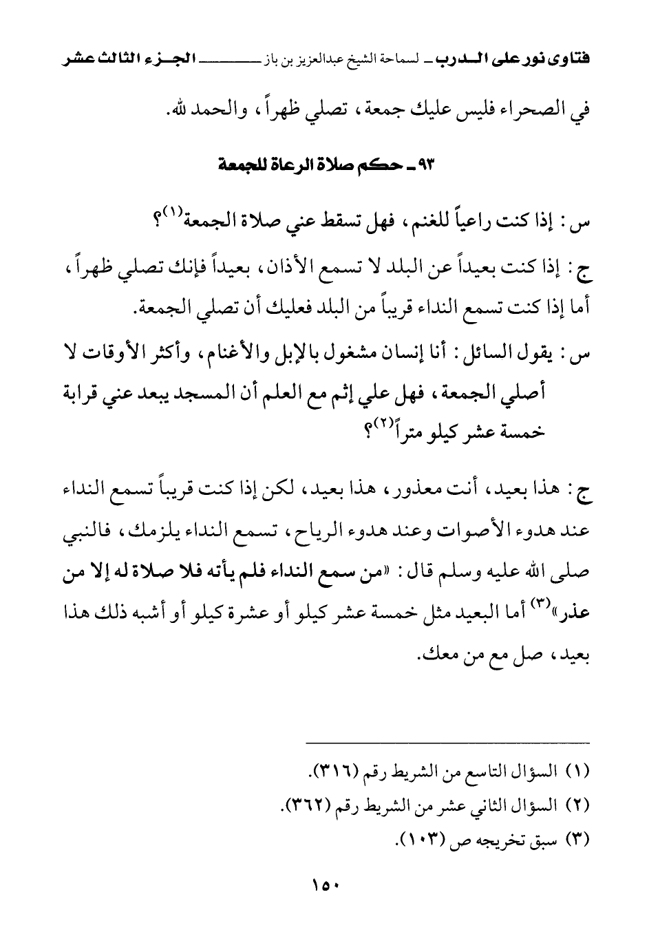 ج: هذا بعيد، أنت معذور، هذا بعيد، لكن إذا كنت قريبا تسمع النداء عند هدوء الأصوات وعند هدوء الرياح، تسمع النداء يلزمك، فالنبي صلى الله عليه وسلم قال: «من سمع النداء فلم يأته فلا صلاة له إلا من عذر (¬2)» أما البعيد مثل خمسة عشر كيلو أو عشرة كيلو أو أشبه ذلك هذا بعيد، صل مع من معك.