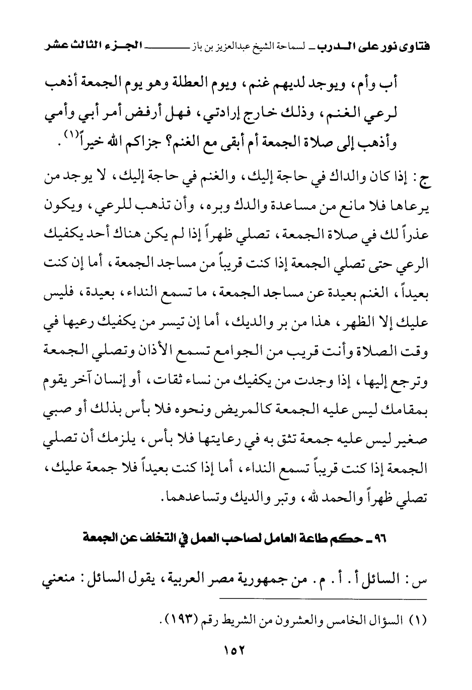 ج: إذا كان والداك في حاجة إليك، والغنم في حاجة إليك، لا يوجد من يرعاها فلا مانع من مساعدة والدك وبره، وأن تذهب للرعي، ويكون عذرا لك في صلاة الجمعة، تصلي ظهرا إذا لم يكن هناك أحد يكفيك الرعي حتى تصلي الجمعة إذا كنت قريبا من مساجد الجمعة، أما إن كنت بعيدا، الغنم بعيدة عن مساجد الجمعة ما تسمع النداء، بعيدة، فليس عليك إلا الظهر، هذا من بر والديك، أما إن تيسر من يكفيك رعيها في وقت الصلاة وأنت قريب من الجوامع تسمع الأذان وتصلي الجمعة وترجع إليها، إذا وجدت من يكفيك من نساء ثقات، أو إنسان آخر يقوم بمقامك ليس عليه الجمعة كالمريض ونحوه فلا بأس بذلك أو صبي صغير ليس عليه جمعة تثق به في رعايتها فلا بأس، يلزمك أن تصلي الجمعة إذا كنت قريبا تسمع النداء، أما إذا كنت بعيدا فلا جمعة عليك، تصلي ظهرا والحمد لله، وتبر والديك وتساعدهما.