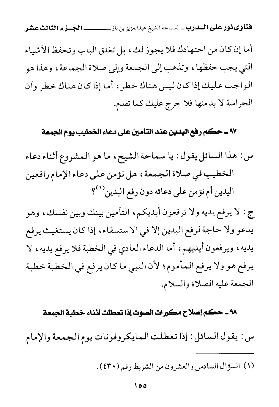 س: هذا السائل يقول: يا سماحة الشيخ، ما هو المشروع أثناء دعاء الخطيب في صلاة الجمعة، هل نؤمن على دعاء الإمام رافعين اليدين أم نؤمن على دعائه دون رفع اليدين (¬1)؟