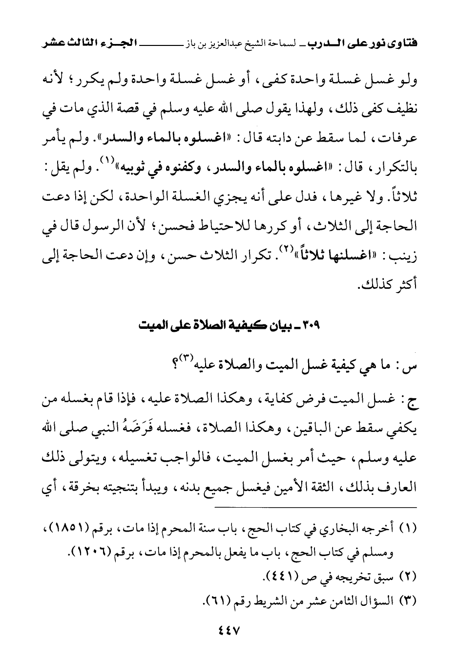 ولو غسل غسلة واحدة كفى، أو غسل غسلة واحدة ولم يكرر؛ لأنه نظيف كفى ذلك، ولهذا يقول صلى الله عليه وسلم في قصة الذي مات في عرفات لما سقط عن دابته، قال: «اغسلوه بالماء والسدر (¬1)». ولم يأمر بالتكرار، قال: «اغسلوه بالماء والسدر، وكفنوه في ثوبيه (¬2)» ولم يقل: ثلاثا. ولا غيرها، فدل على أنه يجزئ الغسلة الواحدة، لكن إذا دعت الحاجة إلى الثلاث، أو كررها للاحتياط فحسن؛ لأن الرسول قال في زينب: «اغسلنها ثلاثا (¬3)» تكرار الثلاث حسن، وإن دعت الحاجة إلى أكثر كذلك.