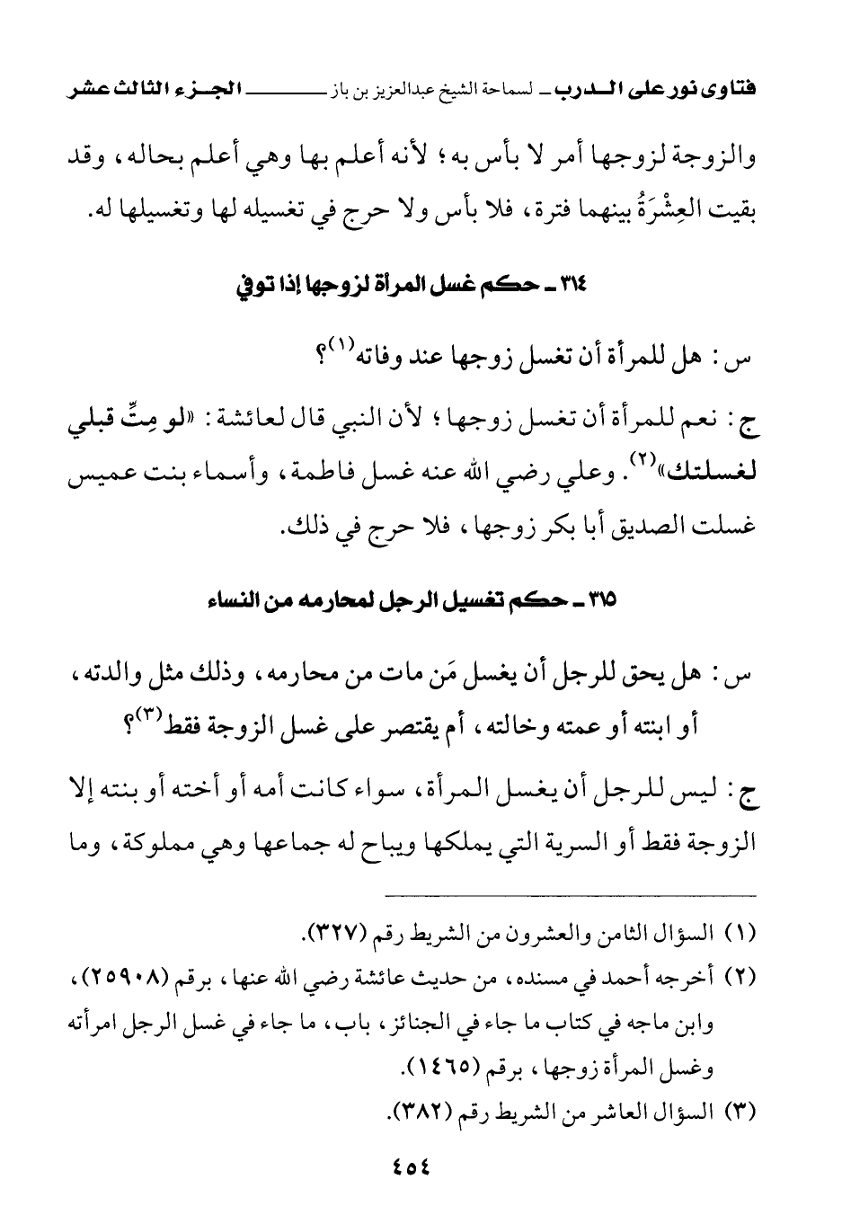 ج: نعم للمرأة أن تغسل زوجها، لأن النبي قال لعائشة: «لو مت قبلي لغسلتك (¬2)» وعلي رضي الله عنه غسل فاطمة، وأسماء بنت عميس غسلت الصديق أبا بكر زوجها، فلا حرج في ذلك.