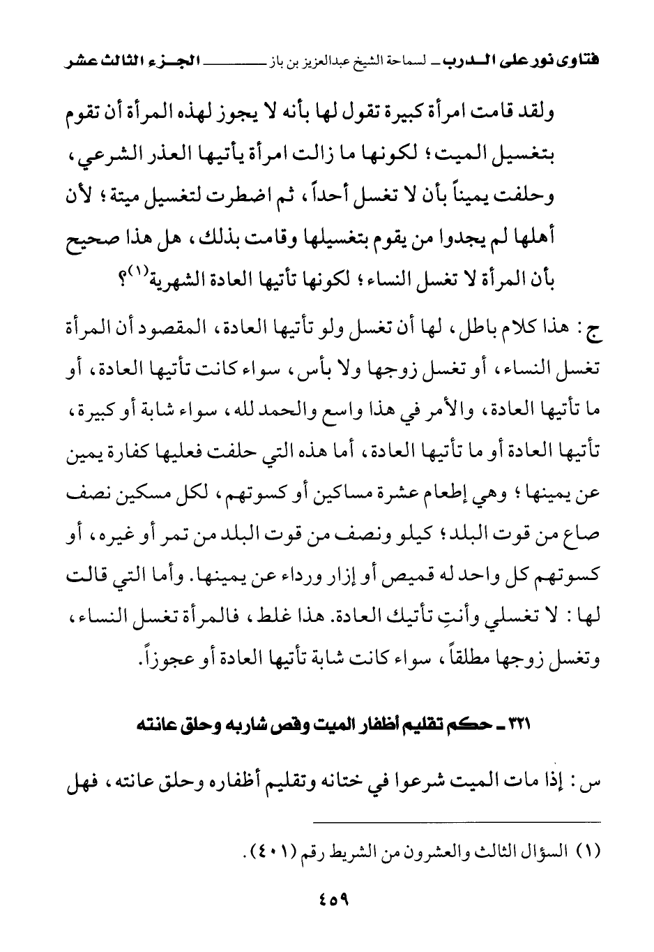 ج: هذا كلام باطل، لها أن تغسل ولو تأتيها العادة، المقصود أن المرأة تغسل النساء أو تغسل زوجها ولا بأس، سواء كانت تأتيها العادة، أو ما تأتيها العادة، والأمر في هذا واسع والحمد لله، سواء شابة أو كبيرة، تأتيها العادة أو ما تأتيها العادة، أما هذه التي حلفت فعليها كفارة يمين عن يمينها، وهي إطعام عشرة مساكين أو كسوتهم، لكل مسكين نصف صاع من قوت البلد، كيلو ونصف من قوت البلد من تمر أو غيره، أو كسوتهم كل واحد له قميص أو إزار ورداء عن يمينها، وأما التي قالت لها: لا تغسلي وأنت تأتيك العادة، هذا غلط، فالمرأة تغسل النساء وتغسل زوجها مطلقا، سواء كانت شابة تأتيها العادة أو عجوزا.