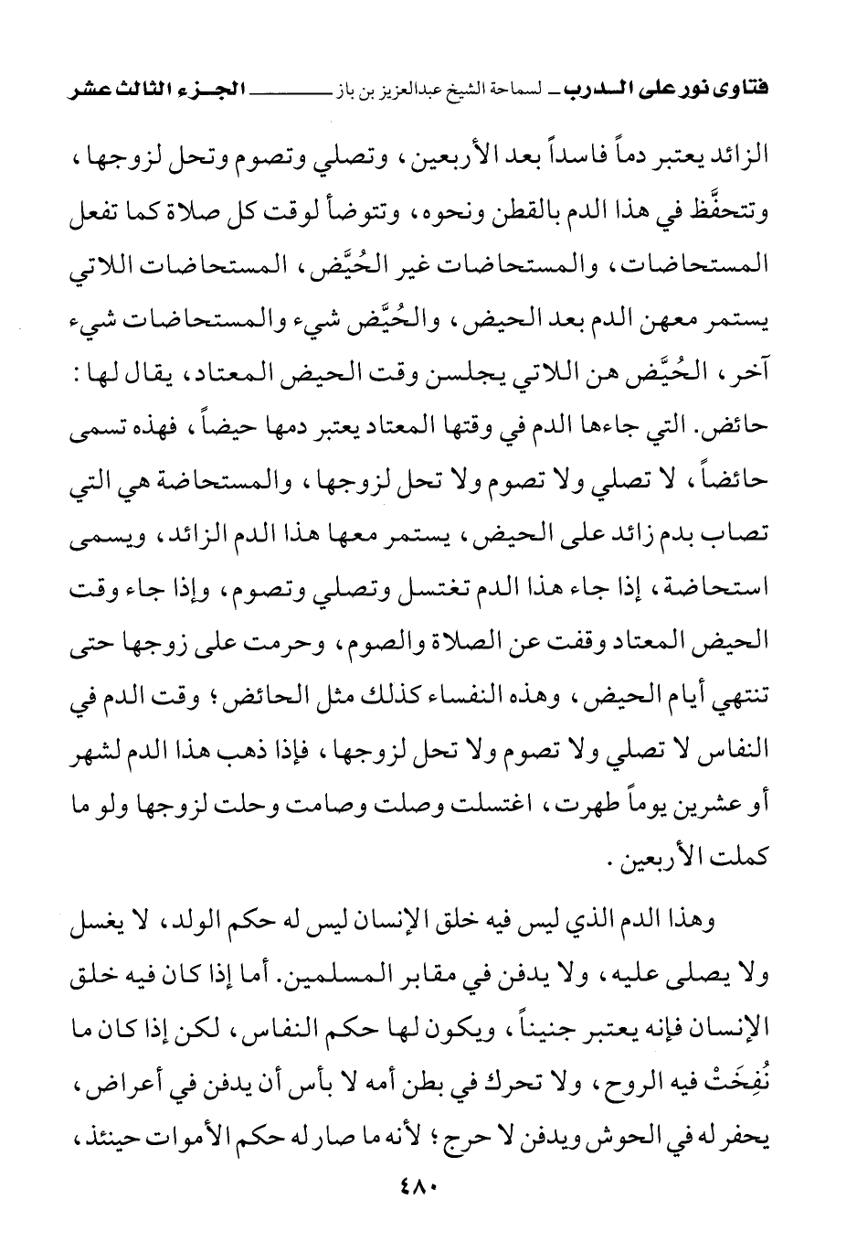 الزائد يعتبر دما فاسدا بعد الأربعين، وتصلي وتصوم وتحل لزوجها، وتتحفظ في هذا الدم بالقطن ونحوه، وتتوضأ لوقت كل صلاة كما تفعل المستحاضات، والمستحاضات غير الحيض، المستحاضات اللاتي يستمر معهن الدم بعد الحيض، والحيض شيء والمستحاضات شيء آخر، الحيض هن اللاتي يجلسن وقت الحيض المعتاد يقال لها: حائض التي جاءها الدم في وقتها المعتاد يعتبر دمها حيضا، فهذه تسمى حائضا لا تصلي ولا تصوم ولا تحل لزوجها، والمستحاضة هي التي تصاب بدم زائد على الحيض يستمر معها هذا الدم الزائد ويسمى استحاضة، إذا جاء هذا الدم تغتسل وتصلي وتصوم وإذا جاء وقت الحيض المعتاد وقفت عن الصلاة والصوم وحرمت على زوجها حتى تنتهي أيام الحيض، وهذه النفساء كذلك مثل الحائض، وقت الدم في النفاس لا تصلي ولا تصوم ولا تحل لزوجها، فإذا ذهب هذا الدم لشهر أو عشرين يوما طهرت، اغتسلت وصلت وصامت وحلت لزوجها ولو ما كملت الأربعين.