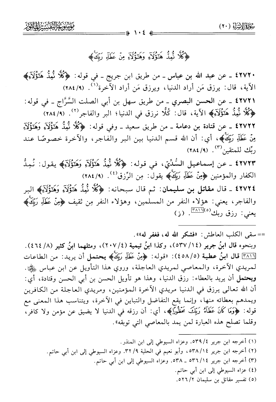 ٤٢٧٢٠ - عن عبد الله بن عباس -من طريق ابن جريج- في قوله: {كلا نمد هؤلاء} الآية، قال: يرزق مَن أراد الدنيا، ويرزق مَن أراد الآخرة (¬١). (٩/ ٢٨٤)