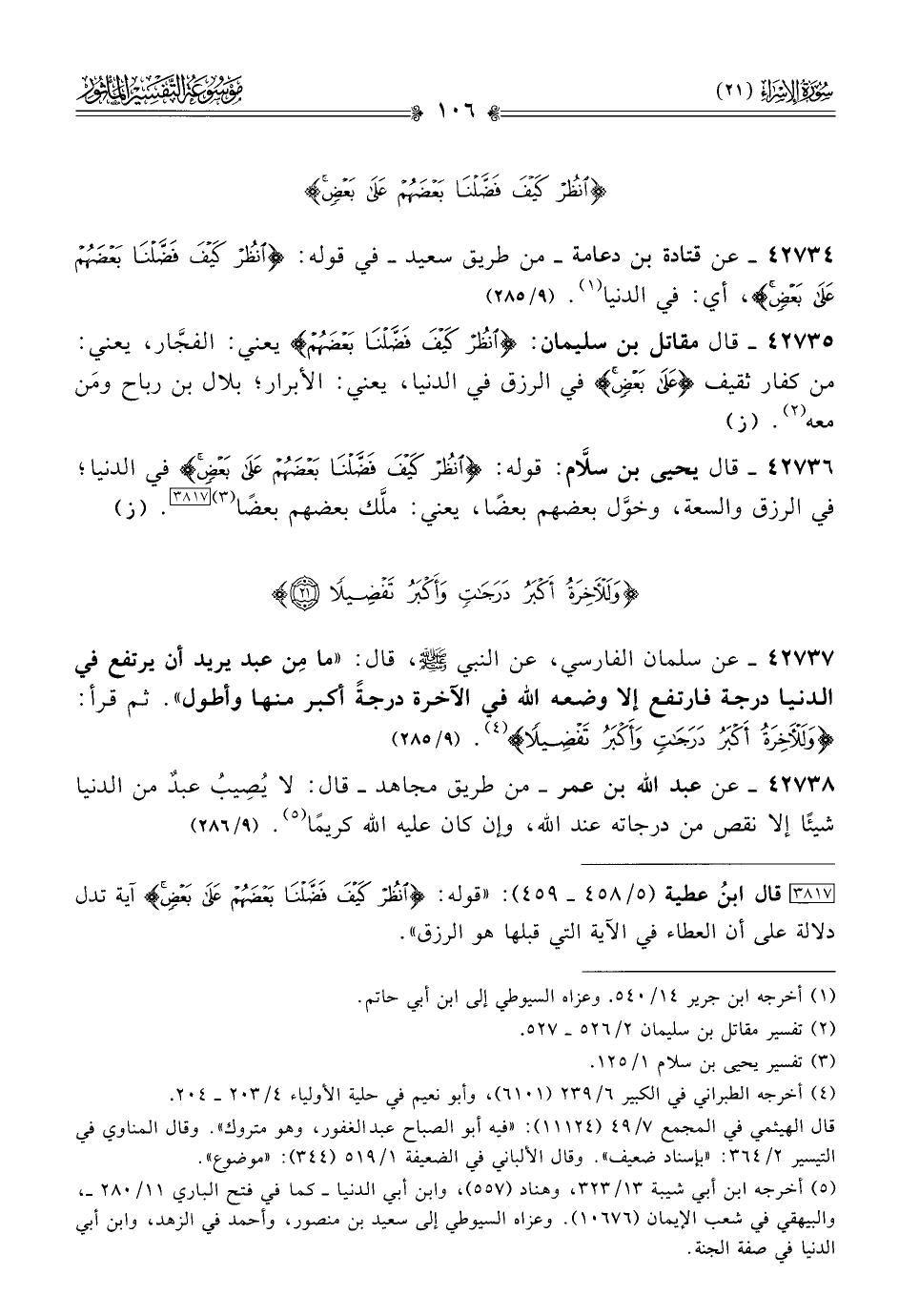 ٤٢٧٣٤ - عن قتادة بن دعامة -من طريق سعيد- في قوله: {انظر كيف فضلنا بعضهم على بعض}، أي: في الدنيا (¬١).