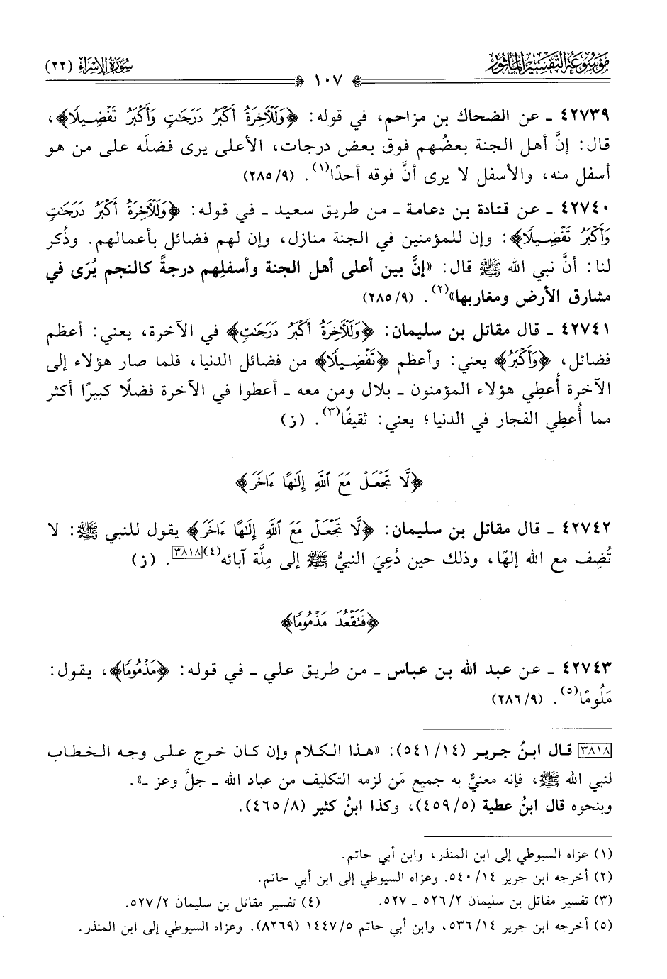٤٢٧٣٩ - عن الضحاك بن مزاحم، في قوله: {وللآخرة أكبر درجات وأكبر تفضيلًا}، قال: إنّ أهل الجنة بعضُهم فوق بعض درجات، الأعلى يرى فضلَه على من هو أسفل منه، والأسفل لا يرى أنّ فوقه أحدًا (¬١). (٩/ ٢٨٥)