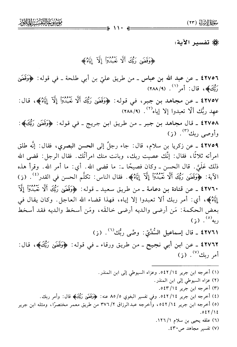 ٤٢٧٥٨ - قال مجاهد بن جبر -من طريق ابن جريج- في قوله: {وقضى ربك}: وأوصى ربك (¬٣). (ز)