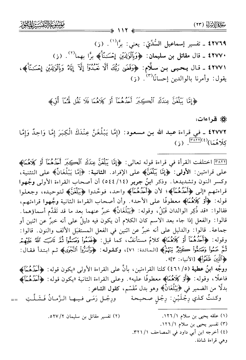 ٤٢٧٧٢ - في قراءة عبد الله بن مسعود: (إمّا يَبْلُغَنَّ عِنْدَكَ الكِبَرَ إمّا واحِدٌ وإمّا كِلاهُما) (¬٤) [٣٨٢٢]. (ز)