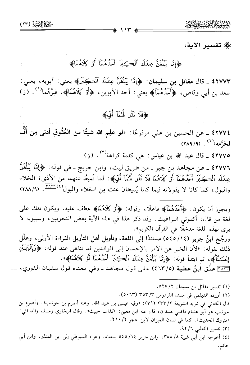 ٤٢٧٧٦ - عن مجاهد بن جبر -من طريق ليث، وابن جريج- في قوله: {إما يبلغن عندك الكبر أحدهما أو كلاهما فلا تقل لهما أُفٍ}: لما تُميطُ عنهما من الأذى؛ الخلاء والبول، كما كانا لا يقولانه فيما كانا يُميطان عنك مِن الخلاء والبول (¬٤) [٣٨٢٣]. (٩/ ٢٨٨)