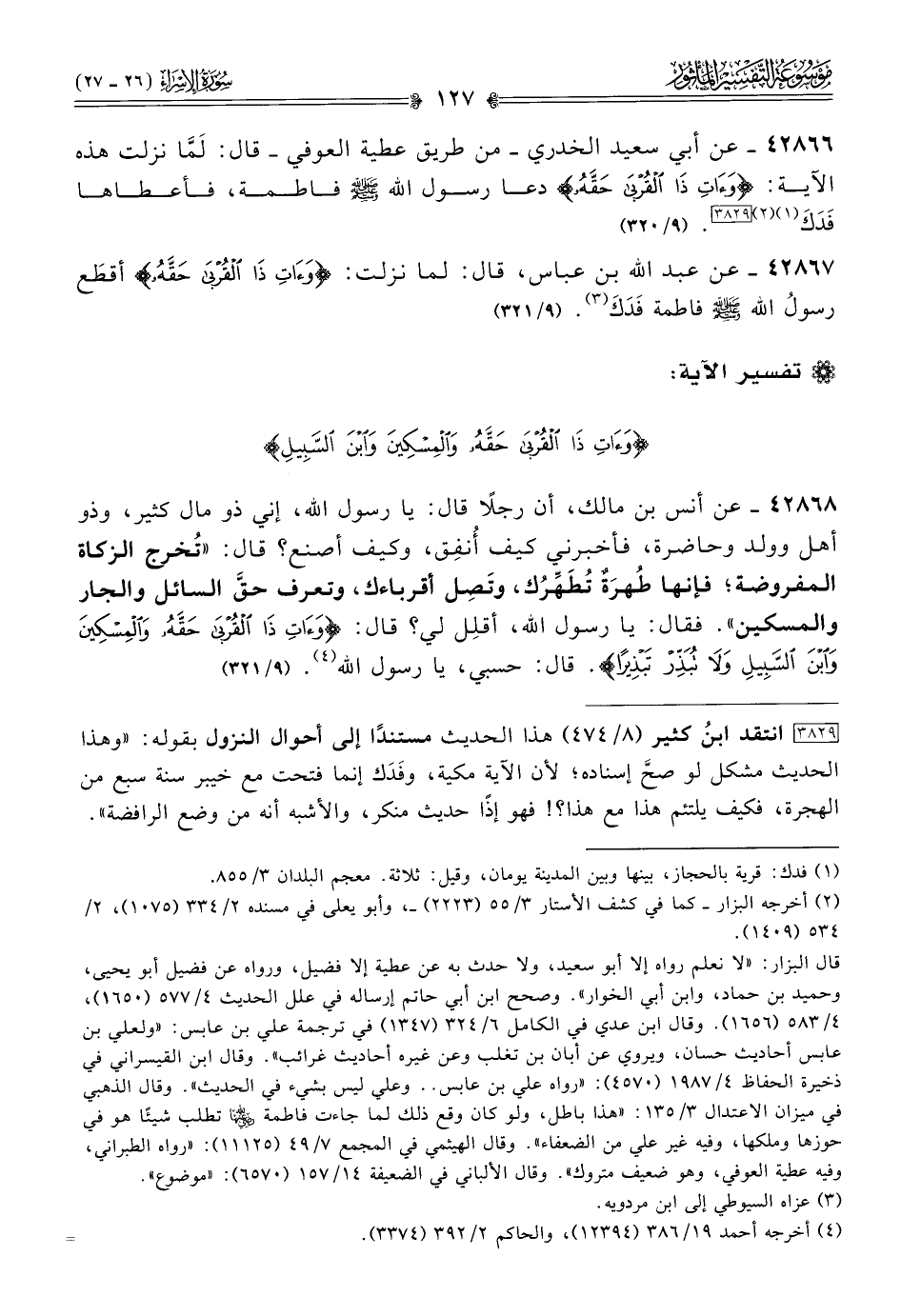 ٤٢٨٦٦ - عن أبي سعيد الخدري -من طريق عطية العوفي- قال: لَمّا نزلت هذه الآية: {وءات ذا القربى حقه} دعا رسول الله - صلى الله عليه وسلم - فاطمة، فأعطاها فَدَكَ (¬١) (¬٢) [٣٨٢٩]. (٩/ ٣٢٠)