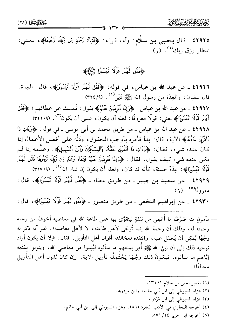 ٤٢٩٢٧ - عن عبد الله بن عباس: {وإمّا تُعِرَضَّن عنهم} يقول: تُمسك عن عطائهم؛ {فقل لهم قولًا ميسورًا} يعني: قولًا معروفًا: لعله أن يكون، عسى أن يكون (¬٣). (٩/ ٣٢١)