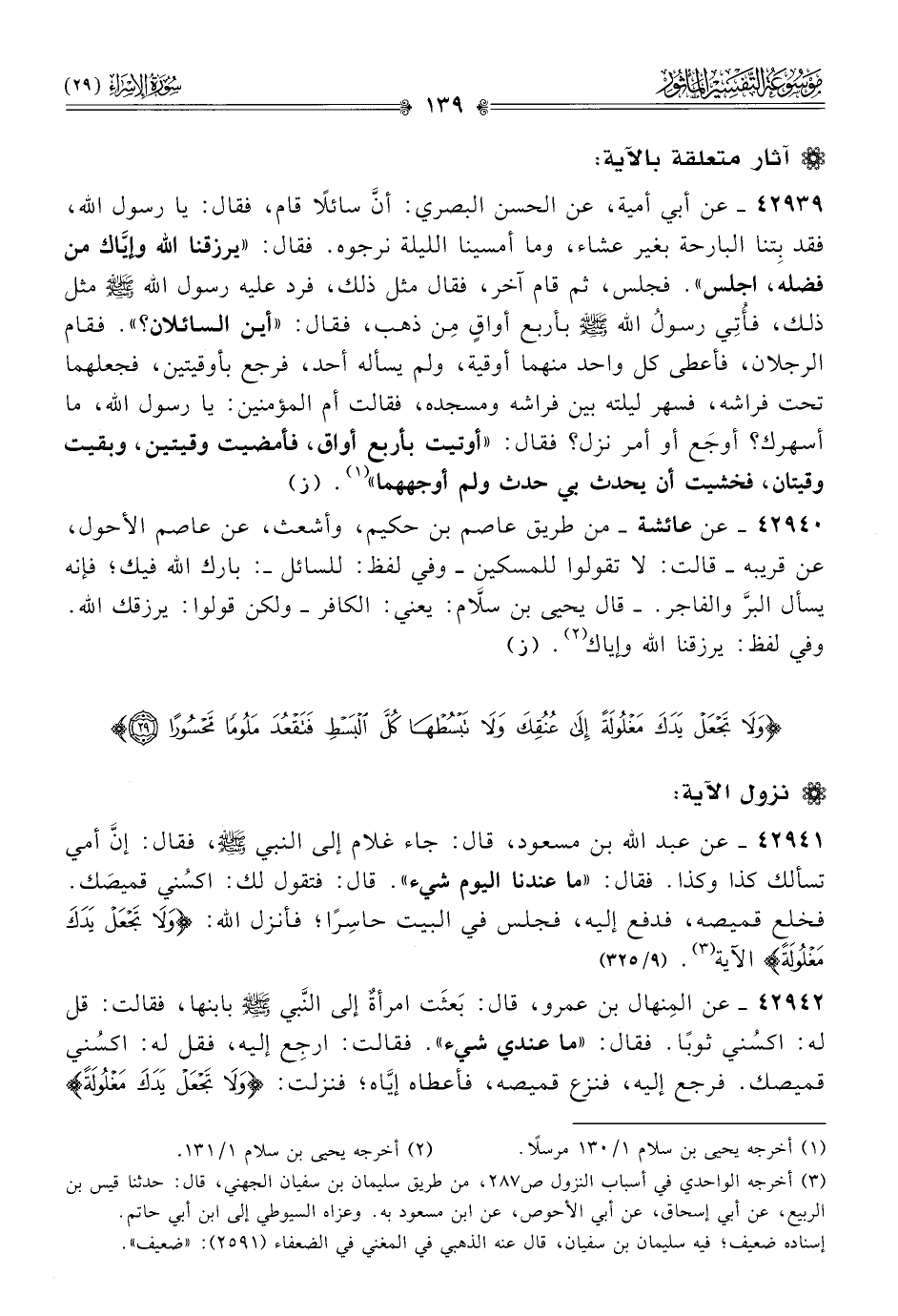٤٢٩٤٢ - عن المِنهال بن عمرو، قال: بَعثَت امرأةٌ إلى النَّبي - صلى الله عليه وسلم - بابنها، فقالت: قل له: اكسُني ثوبًا. فقال: «ما عندي شيء». فقالت: ارجِع إليه، فقل له: اكسُني قميصك. فرجع إليه، فنزع قميصه، فأعطاه إيّاه؛ فنزلت: {ولا تجعل يدك مغلولة}