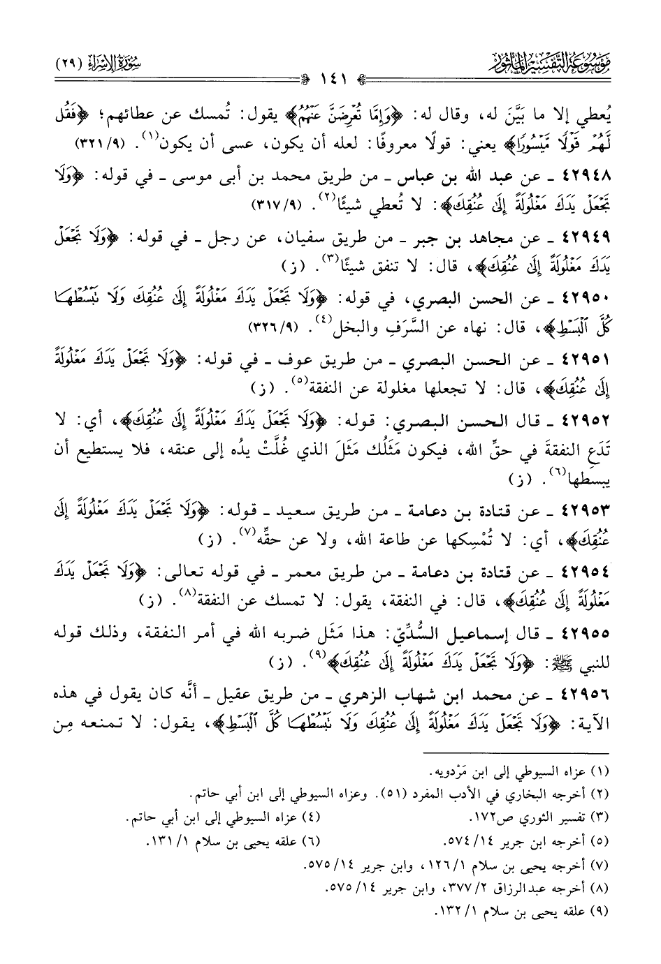 ٤٢٩٥٦ - عن محمد ابن شهاب الزهري -من طريق عقيل- أنّه كان يقول في هذه الآية: {ولا تجعل يدك مغلولة إلى عنقك ولا تبسطها كل البسط}، يقول: لا تمنعه مِن
