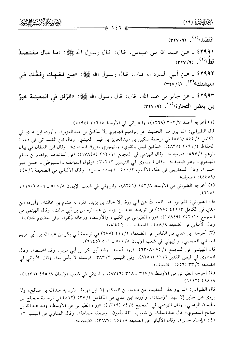 ٤٢٩٩٣ - عن جابر بن عبد الله، قال: قال رسول الله - صلى الله عليه وسلم -: «الرِّفق في المعيشة خيرٌ مِن بعض التجارة» (¬٤). (٩/ ٣٢٧)