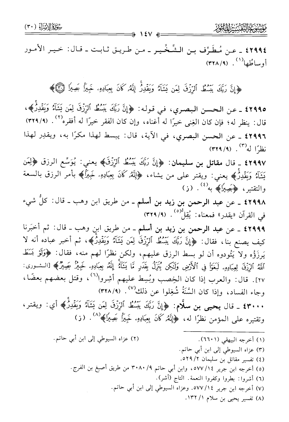 ٤٢٩٩٩ - عن عبد الرحمن بن زيد بن أسلم -من طريق ابن وهب- قال: ثم أخبَرنا كيف يصنع بنا، فقال: {إن ربك يبسط الرزق لمن يشاء ويقدر}، ثم أخبر عباده أنه لا يَرزَؤُه ولا يَئُودوه أن لو بسط الرزق عليهم، ولكن نظرًا لهم منه، فقال: {ولو بسط الله الرزق لعباده لبغوا في الأرض ولكن يُنزل بقدر ما يشاء إنه بعباده خبير بصير} [الشورى: ٢٧]. قال: والعرب إذا كان الخِصب وبُسِط عليهم أشِروا (¬٦)، وقتل بعضهم بعضًا، وجاء الفساد، وإذا كان السَّنَةُ شُغِلوا عن ذلك (¬٧). (٩/ ٣٢٨)