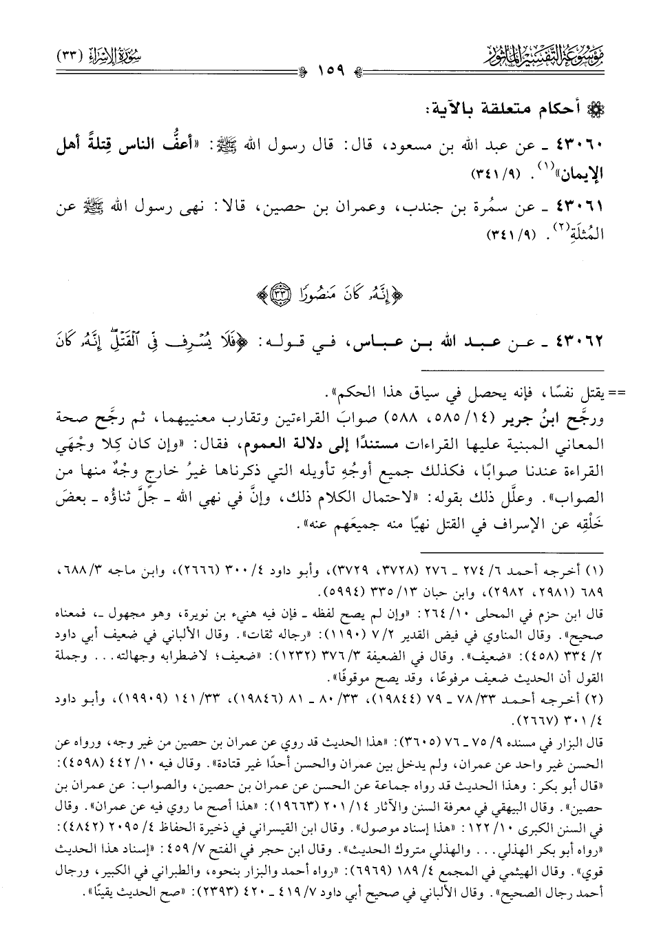 ٤٣٠٦٠ - عن عبد الله بن مسعود، قال: قال رسول الله - صلى الله عليه وسلم -: «أعفُّ الناس قِتلةً أهل الإيمان» (¬١).