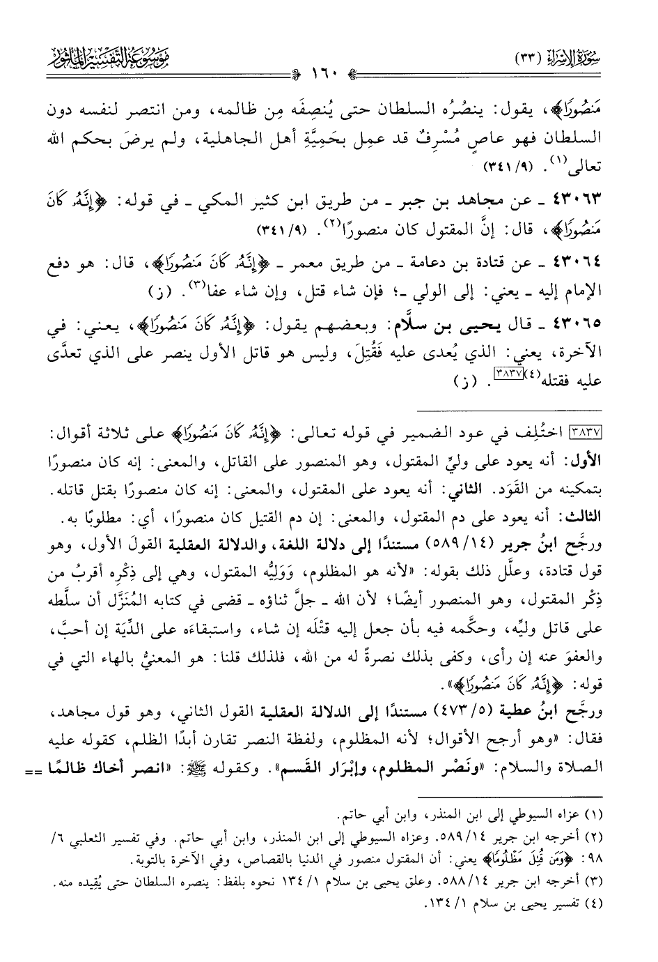 [٣٨٣٧] اختُلِف في عود الضمير في قوله تعالى: {إنَّهُ كانَ مَنصُورًا} على ثلاثة أقوال: الأول: أنه يعود على وليِّ المقتول، وهو المنصور على القاتل، والمعنى: إنه كان منصورًا بتمكينه من القَوَد. الثاني: أنه يعود على المقتول، والمعنى: إنه كان منصورًا بقتل قاتله. الثالث: أنه يعود على دم المقتول، والمعنى: إن دم القتيل كان منصورًا، أي: مطلوبًا به.