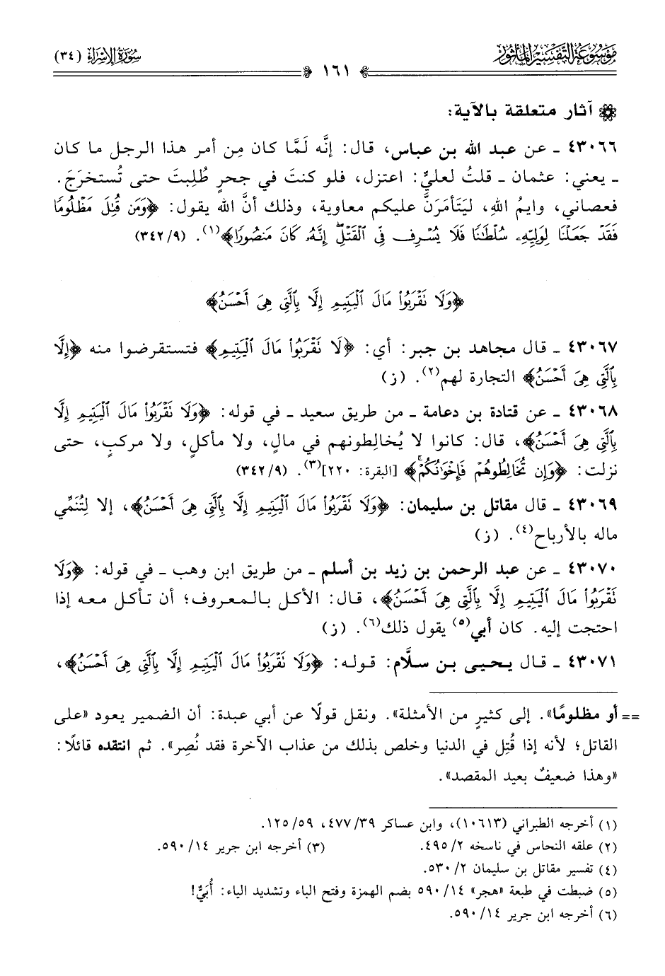 ٤٣٠٦٩ - قال مقاتل بن سليمان: {ولا تقربوا مال اليتيم إلا بالتي هي أحسن}، إلا لِتُنَمِّي ماله بالأرباح (¬٤). (ز)