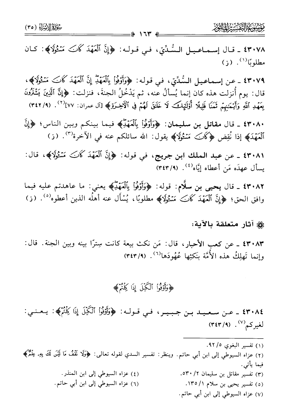 ٤٣٠٧٩ - عن إسماعيل السُّدِّيّ، في قوله: {وأوفوا بالعهد إن العهد كان مسئولًا}، قال: يوم أُنزلت هذه كان إنما يُسألُ عنه، ثم يَدْخُلُ الجنةَ، فنزلت: {إن الذين يشترون بعهد الله وأيمانهم ثمنًا قليلًا أولئك لا خلاق لهم في الآخرة} [آل عمران: ٧٧] (¬٢). (٩/ ٣٤٢)