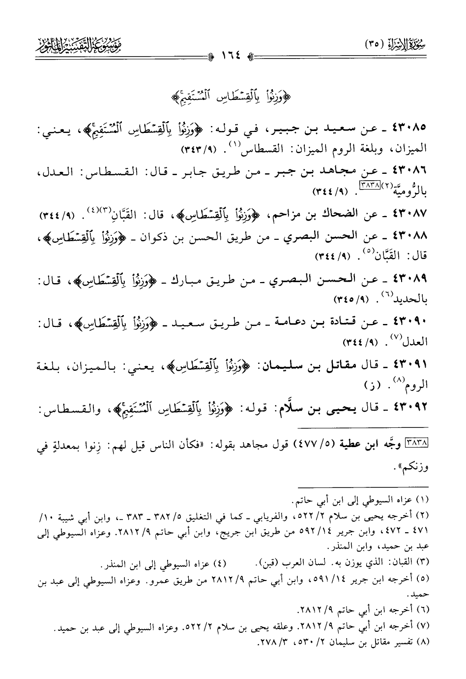 ٤٣٠٩٠ - عن قتادة بن دعامة -من طريق سعيد- {وزنوا بالقسطاس}، قال: العدل (¬٧). (٩/ ٣٤٤)