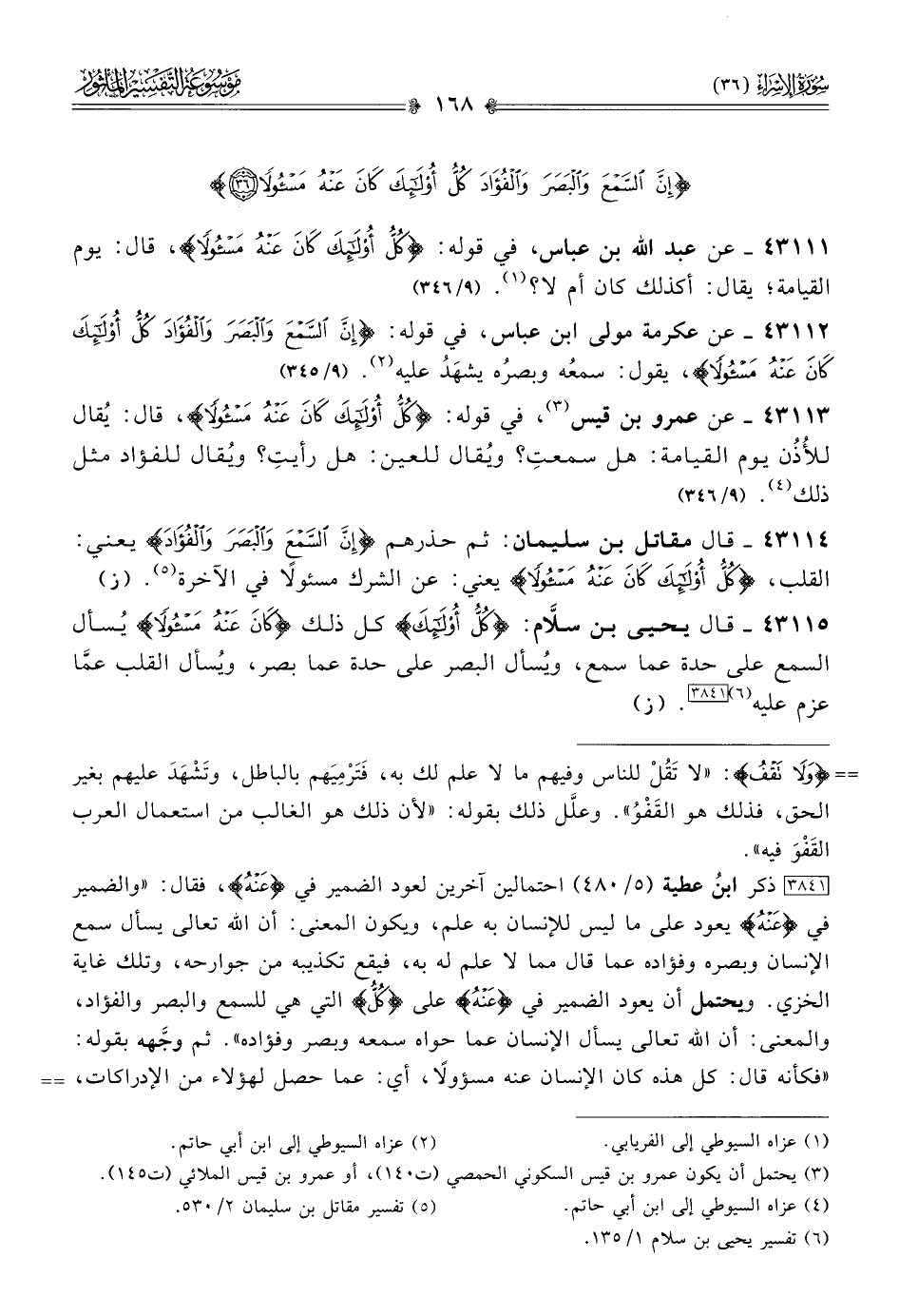 ٤٣١١٥ - قال يحيى بن سلّام: {كل أولئك} كل ذلك {كان عنه مسئولا} يُسأل السمع على حدة عما سمع، ويُسأل البصر على حدة عما بصر، ويُسأل القلب عمّا عزم عليه (¬٦) [٣٨٤١]. (ز)