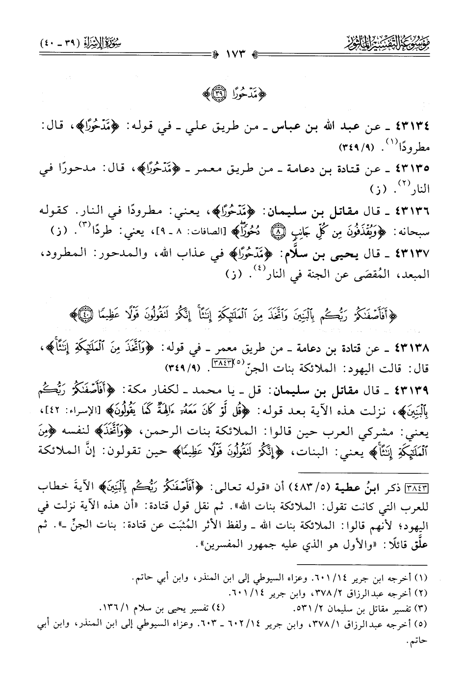 [٣٨٤٣] ذكر ابنُ عطية (٥/ ٤٨٣) أن «قوله تعالى: {أفَأَصْفاكُمْ رَبُّكُمْ بِالبَنِينَ} الآيةَ خطاب للعرب التي كانت تقول: الملائكة بنات الله». ثم نقل قول قتادة: «أن هذه الآية نزلت في اليهود؛ لأنهم قالوا: الملائكة بنات الله -ولفظ الأثر المُثبَت عن قتادة: بنات الجنِّ-». ثم علَّق قائلًا: «والأول هو الذي عليه جمهور المفسرين».
