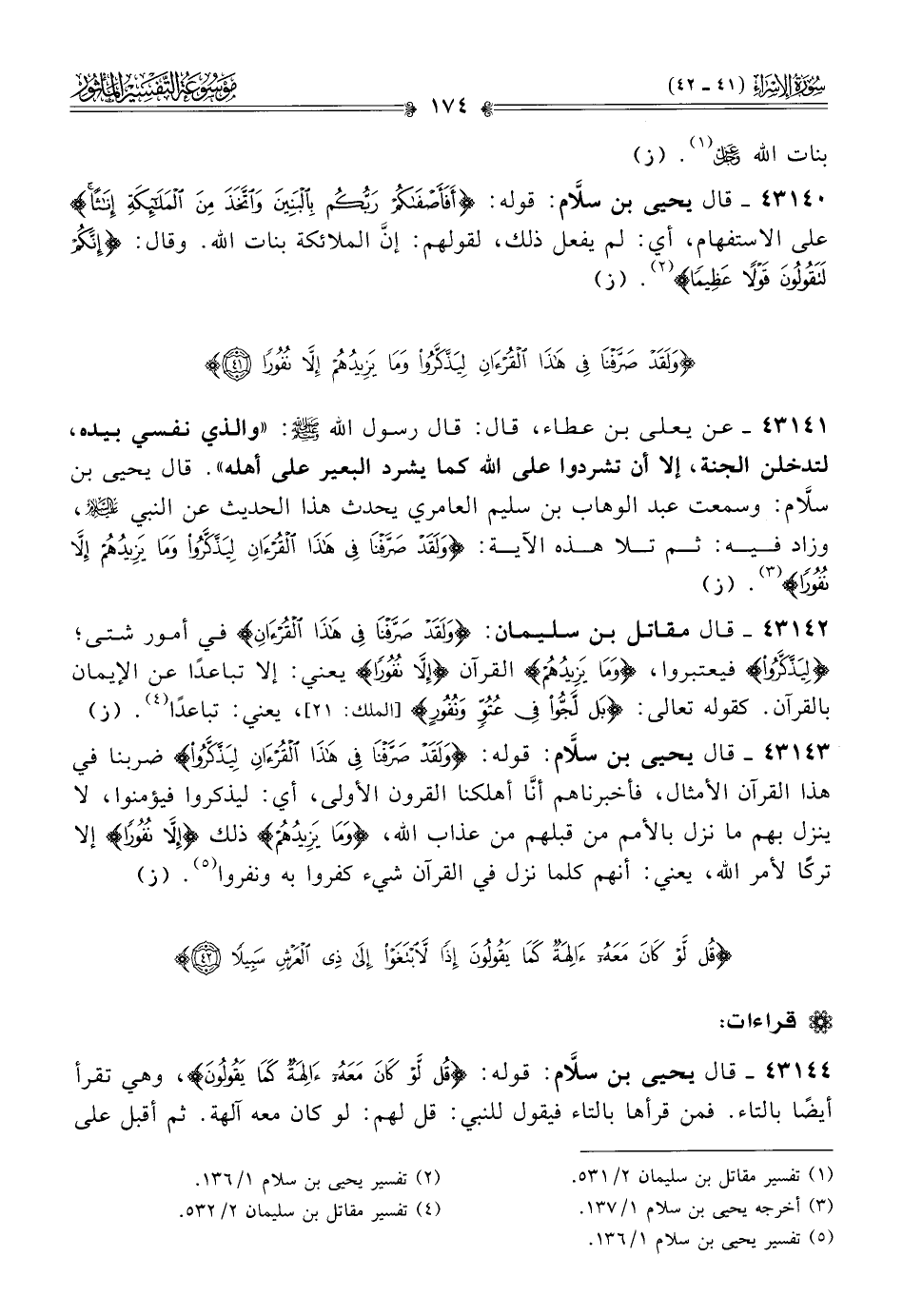 ٤٣١٤٣ - قال يحيى بن سلّام: قوله: {ولقد صرفنا في هذا القرءان ليذكروا} ضربنا في هذا القرآن الأمثال، فأخبرناهم أنّا أهلكنا القرون الأولى، أي: ليذكروا فيؤمنوا، لا ينزل بهم ما نزل بالأمم من قبلهم من عذاب الله، {وما يزيدهم} ذلك {إلا نفورا} إلا تركًا لأمر الله، يعني: أنهم كلما نزل في القرآن شيء كفروا به ونفروا (¬٥). (ز)