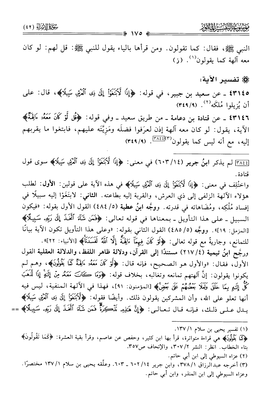 ٤٣١٤٦ - عن قتادة بن دعامة -من طريق سعيد- وفي قوله: {قل لو كان معه آلهة} الآية، يقول: لو كان معه آلهة إذن لعرَفوا فضلَه ومَزِيَّتَه عليهم، فابتغوا ما يقربهم إليه، مع أنه ليس كما يقولون (¬٣) [٣٨٤٤]. (٩/ ٣٤٩)