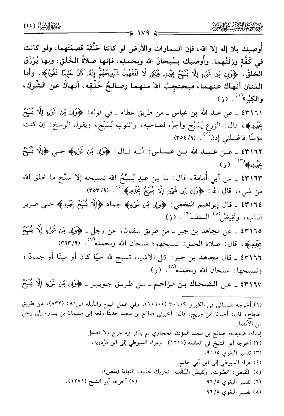 ٤٣١٦٣ - عن أبي أُمامة، قال: ما مِن عبدٍ يُسبِّحُ الله تسبيحة إلا سبَّح ما خلق الله من شيء، قال الله: {وإن من شيء إلا يسبح بحمده} (¬٤). (٩/ ٣٥٣)