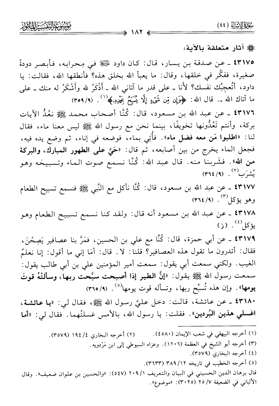 ٤٣١٧٧ - عن عبد الله بن مسعود، قال: كُنّا نأكل مع النَّبي - صلى الله عليه وسلم - فنسمع تسبيح الطعام وهو يؤكل (¬٣). (٩/ ٣٦٤)