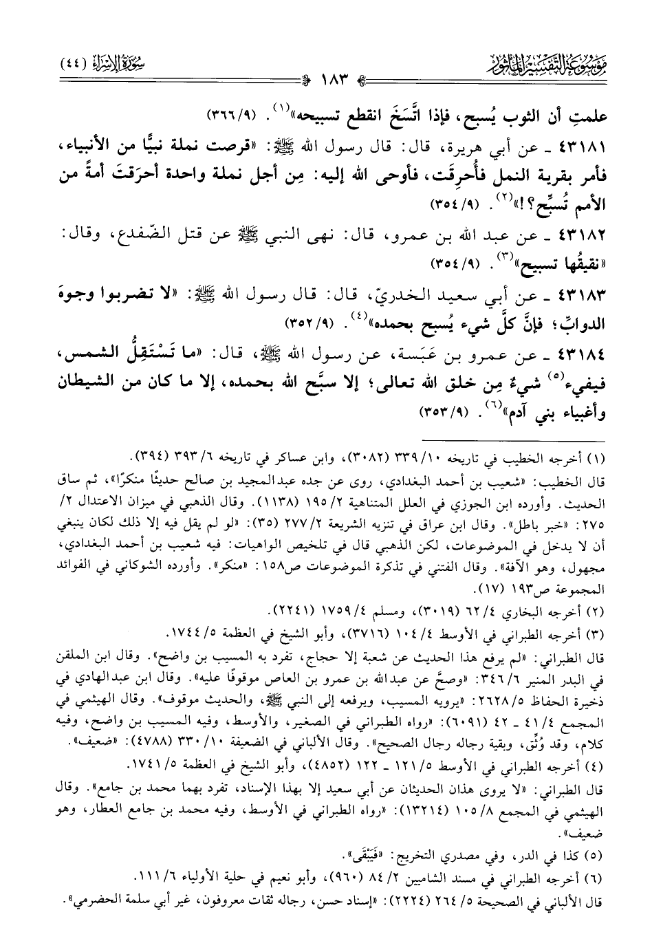 ٤٣١٨٣ - عن أبي سعيد الخدريّ، قال: قال رسول الله - صلى الله عليه وسلم -: «لا تضربوا وجوهَ الدوابِّ؛ فإنّ كلَّ شيء يُسبح بحمده» (¬٤). (٩/ ٣٥٢)