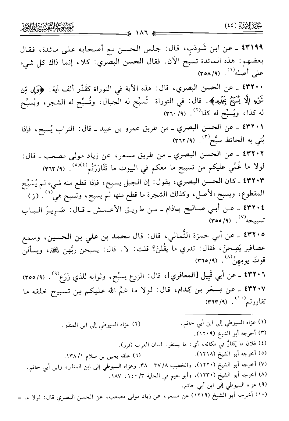 ٤٣٢٠٠ - عن الحسن البصري، قال: هذه الآية في التوراة كقَدْر ألف آية: {وإن من شيء إلا يسبح بحمده}. قال: في التوراة: تُسبِّح له الجبال، وتُسبِّح له الشجر، ويُسبِّح له كذا، ويُسبِّح له كذا (¬٢). (٩/ ٣٦٠)