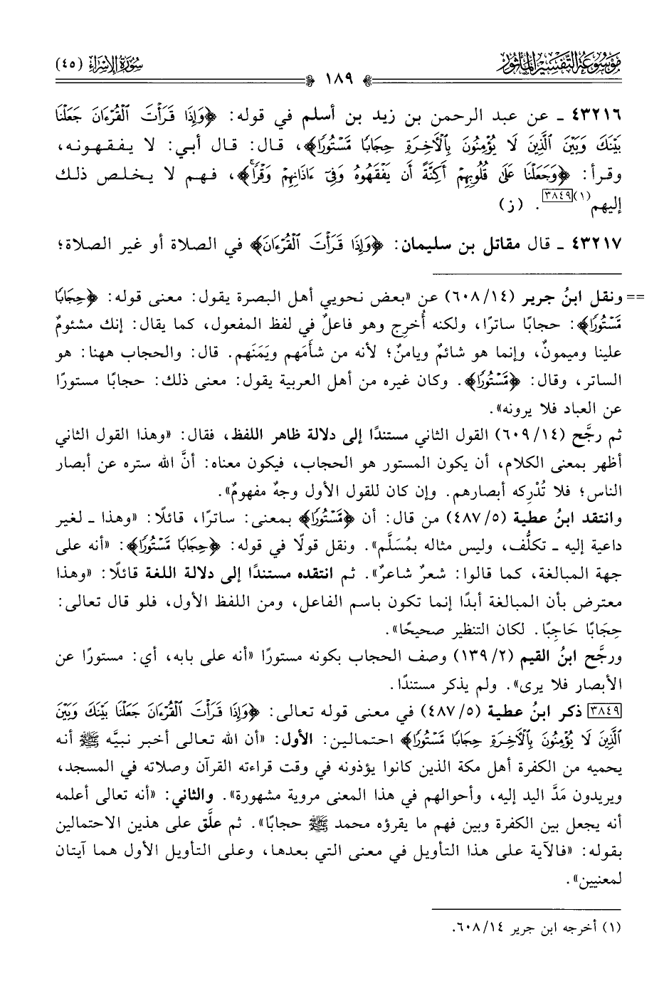 [٣٨٤٩] ذكر ابنُ عطية (٥/ ٤٨٧) في معنى قوله تعالى: {وإذا قَرَأْتَ القُرْآنَ جَعَلْنا بَيْنَكَ وبَيْنَ الَّذِينَ لا يُؤْمِنُونَ بِالآخِرَةِ حِجابًا مَسْتُورًا} احتمالين: الأول: «أن الله تعالى أخبر نبيَّه - صلى الله عليه وسلم - أنه يحميه من الكفرة أهل مكة الذين كانوا يؤذونه في وقت قراءته القرآن وصلاته في المسجد، ويريدون مَدَّ اليد إليه، وأحوالهم في هذا المعنى مروية مشهورة». والثاني: «أنه تعالى أعلمه أنه يجعل بين الكفرة وبين فهم ما يقرؤه محمد - صلى الله عليه وسلم - حجابًا». ثم علَّق على هذين الاحتمالين بقوله: «فالآية على هذا التأويل في معنى التي بعدها، وعلى التأويل الأول هما آيتان لمعنيين».