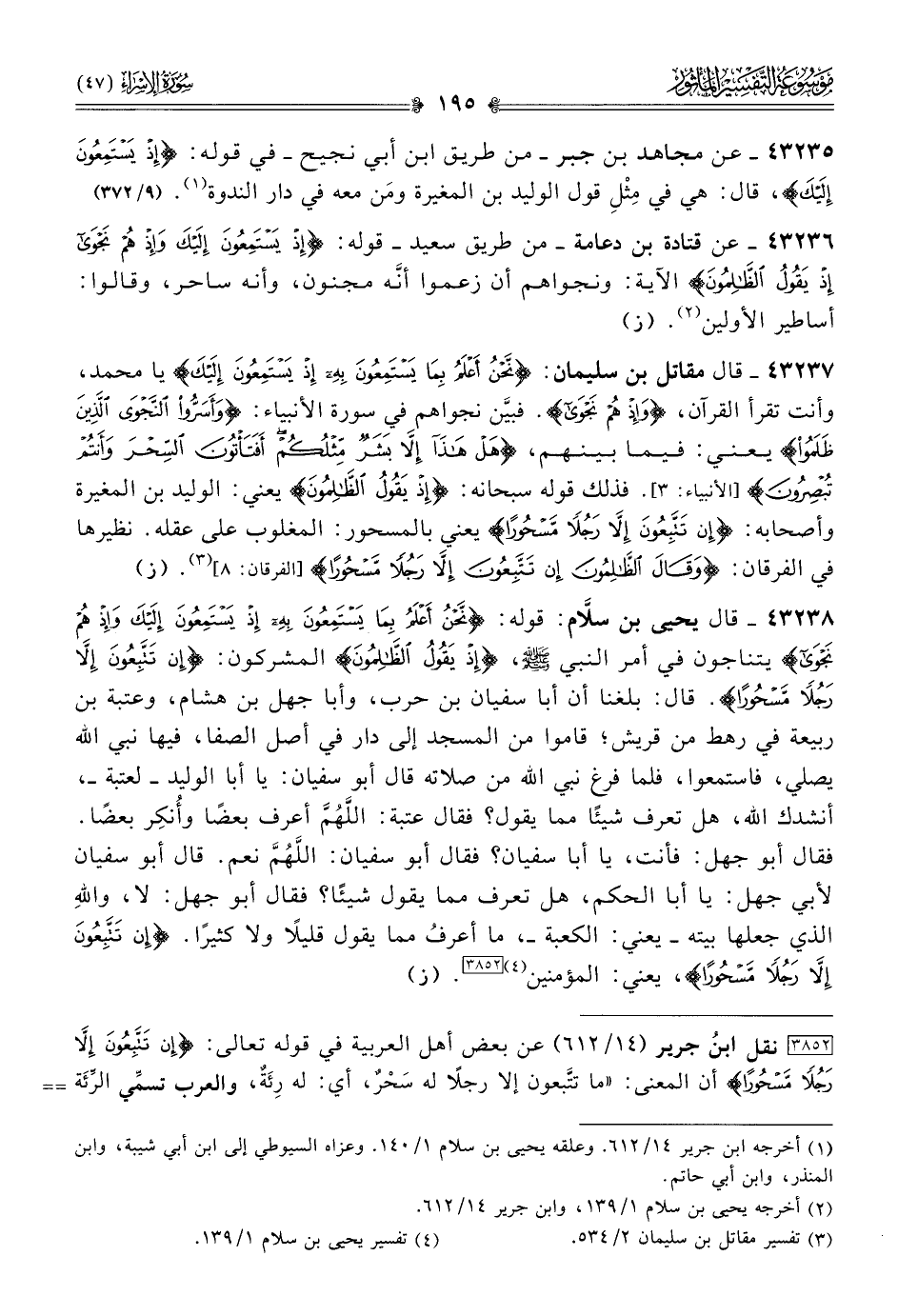 ٤٣٢٣٨ - قال يحيى بن سلّام: قوله: {نحن أعلم بما يستمعون به إذ يستمعون إليك وإذ هم نجوى} يتناجون في أمر النبي - صلى الله عليه وسلم -، {إذ يقول الظالمون} المشركون: {إن تتبعون إلا رجلا مسحورا}. قال: بلغنا أن أبا سفيان بن حرب، وأبا جهل بن هشام، وعتبة بن ربيعة في رهط من قريش؛ قاموا من المسجد إلى دار في أصل الصفا، فيها نبي الله يصلي، فاستمعوا، فلما فرغ نبي الله من صلاته قال أبو سفيان: يا أبا الوليد -لعتبة-، أنشدك الله، هل تعرف شيئًا مما يقول؟ فقال عتبة: اللهم أعرف بعضًا وأُنكِر بعضًا. فقال أبو جهل: فأنت، يا أبا سفيان؟ فقال أبو سفيان: اللهم نعم. قال أبو سفيان لأبي جهل: يا أبا الحكم، هل تعرف مما يقول شيئًا؟ فقال أبو جهل: لا، واللهِ الذي جعلها بيته -يعني: الكعبة-، ما أعرفُ مما يقول قليلًا ولا كثيرًا. {إن تتبعون إلا رجلا مسحورا}، يعني: المؤمنين (¬٤) [٣٨٥٢]. (ز)