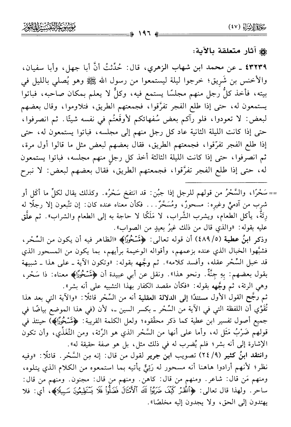 ٤٣٢٣٩ - عن محمد ابن شهاب الزهري، قال: حُدِّثتُ أنّ أبا جهل، وأبا سفيان، والأخنس بن شَرِيق؛ خرجوا ليلة ليستمعوا من رسول الله - صلى الله عليه وسلم - وهو يُصلي بالليل في بيته، فأخذ كلُّ رجل منهم مجلسًا يستمع فيه، وكلٌ لا يعلم بمكان صاحبه، فباتوا يستمعون له، حتى إذا طلع الفجر تفرَّقوا، فجمعتهم الطريق، فتلاوموا، وقال بعضهم لبعض: لا تعودوا، فلو رآكم بعض سُفهائكم لأوقَعتُم في نفسه شيئًا. ثم انصرفوا، حتى إذا كانت الليلة الثانية عاد كل رجل منهم إلى مجلسه، فباتوا يستمعون له، حتى إذا طلع الفجر تفرّقوا، فجمعتهم الطريق، فقال بعضهم لبعض مثل ما قالوا أول مرة، ثم انصرفوا، حتى إذا كانت الليلة الثالثة أخذ كل رجلٍ منهم مجلسه، فباتوا يستمعون له، حتى إذا طلع الفجر تفرَّقوا، فجمعتهم الطريق، فقال بعضهم لبعض: لا نبرح