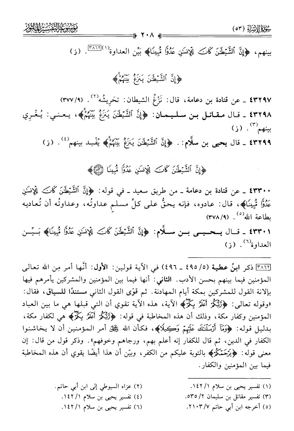 ٤٣٣٠٠ - عن قتادة بن دعامة -من طريق سعيد- في قوله: {إنّ الشَّيطانَ كانَ للإنسانِ عدوًّا مُبينًا}، قال: عادوه، فإنه يحقُّ على كلِّ مسلمٍ عداوتُه، وعداوتُه أن تُعاديه بطاعة الله (¬٥). (٩/ ٣٧٨)