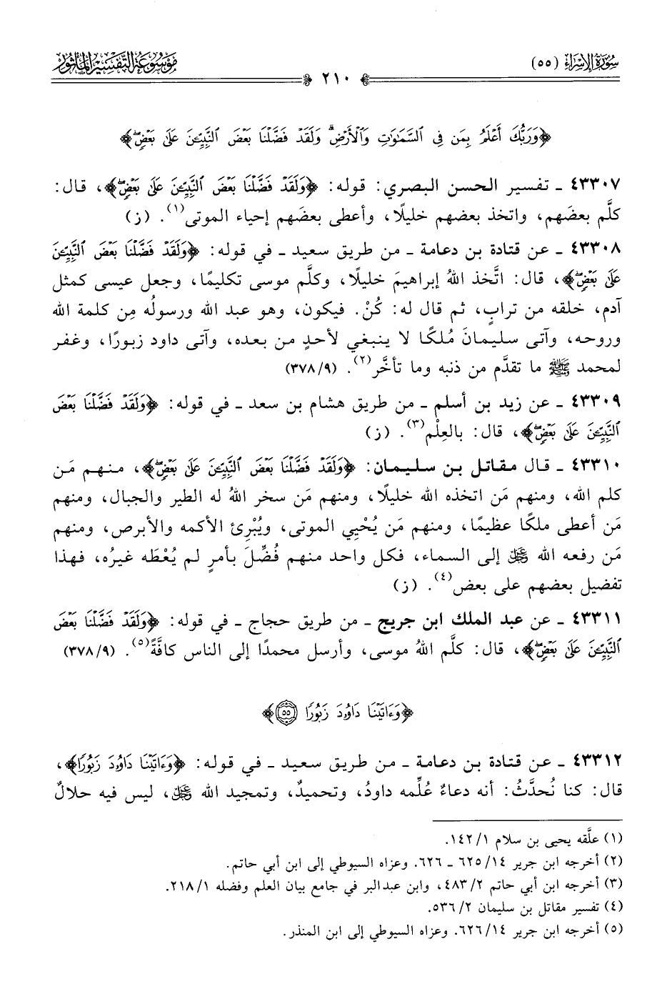 ٤٣٣١٢ - عن قتادة بن دعامة -من طريق سعيد- في قوله: {وآتينا داوُدَ زبورًا}، قال: كنا نُحدَّثُ: أنه دعاءٌ عُلِّمه داودُ، وتحميدٌ، وتمجيد الله - عز وجل -، ليس فيه حلالٌ