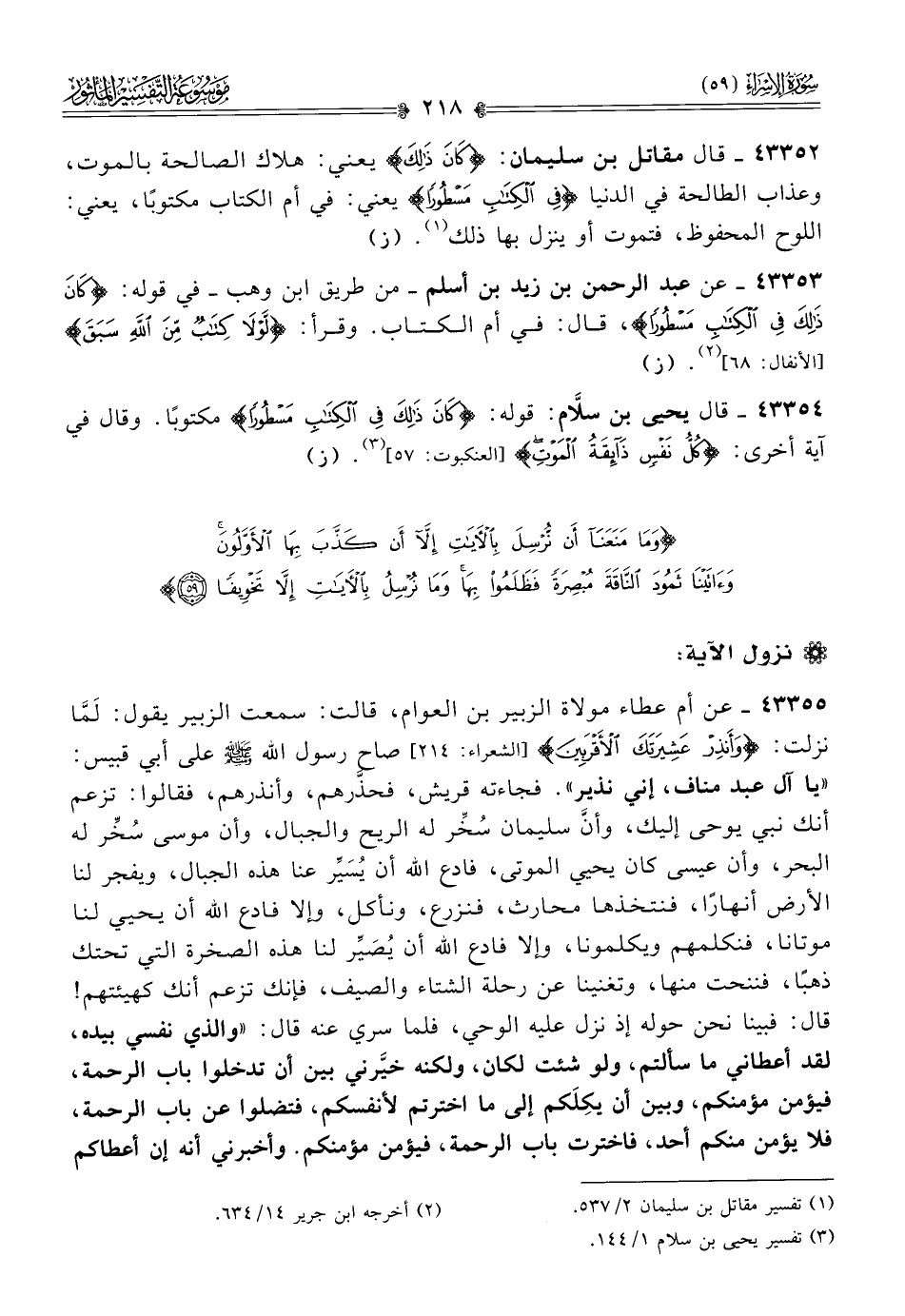 ٤٣٣٥٤ - قال يحيى بن سلّام: قوله: {كان ذلك في الكتاب مسطورا} مكتوبًا. وقال في آية أخرى: {كل نفس ذائقة الموت} [العنكبوت: ٥٧] (¬٣). (ز)