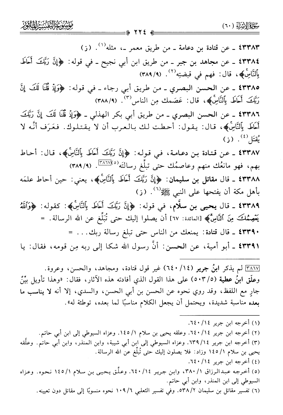 ٤٣٣٨٩ - قال يحيى بن سلّام، في قوله: {إن ربك أحاط بالناس}: كقوله: {والله يعصمك من الناس} [المائدة: ٦٧] أن يصلوا إليك حتى تُبَلِّغ عن الله الرسالة. =