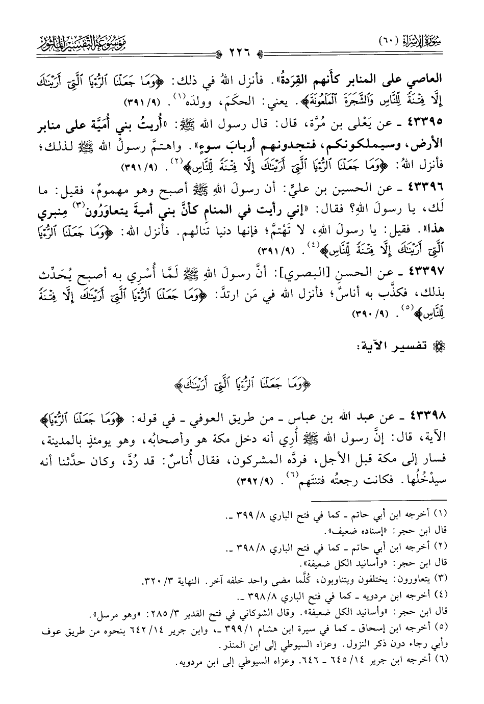 ٤٣٣٩٦ - عن الحسين بن عليٍّ: أن رسولَ اللهِ - صلى الله عليه وسلم - أصبح وهو مهمومٌ، فقيل: ما لَك، يا رسولَ اللهِ؟ فقال: «إني رأيت في المنامِ كأنّ بني أميةَ يتعاوَرُون (¬٣) مِنبري هذا». فقيل: يا رسولَ اللهِ، لا تَهْتمَّ؛ فإنها دنيا تنالهم. فأنزل الله: {وما جعلْنا الرُّؤيا الَّتي أرَيْناك إلّا فتنَةً للناسِ} (¬٤). (٩/ ٣٩١)