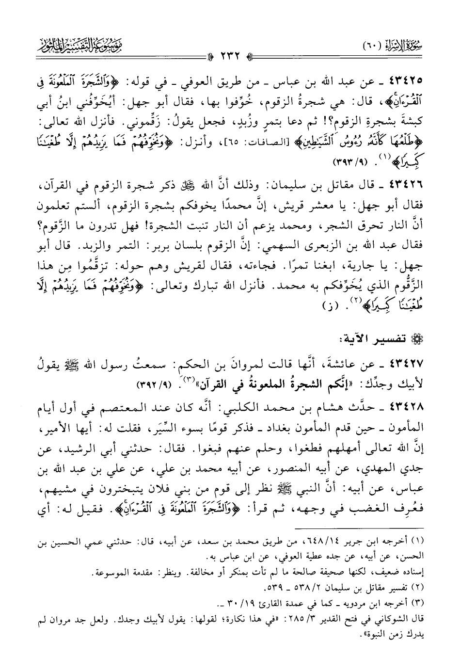٤٣٤٢٥ - عن عبد الله بن عباس -من طريق العوفي- في قوله: {والشَّجَرَةَ الملعُونَةَ في القُرآنِ}، قال: هي شجرةُ الزقوم، خُوِّفوا بها، فقال أبو جهل: أيُخَوِّفُني ابنُ أبي كبشةَ بشجرةِ الزقومِ؟! ثم دعا بتمرٍ وزُبدٍ، فجعل يقولُ: زَقِّموني. فأنزل الله تعالى: {طلعُها كأنّه رُءُوسُ الشياطينِ} [الصافات: ٦٥]، وأنزل: {ونُخوفُهُم فَما يزيدُهُمْ إلّا طغيانًا كبيرًا} (¬١). (٩/ ٣٩٣)
