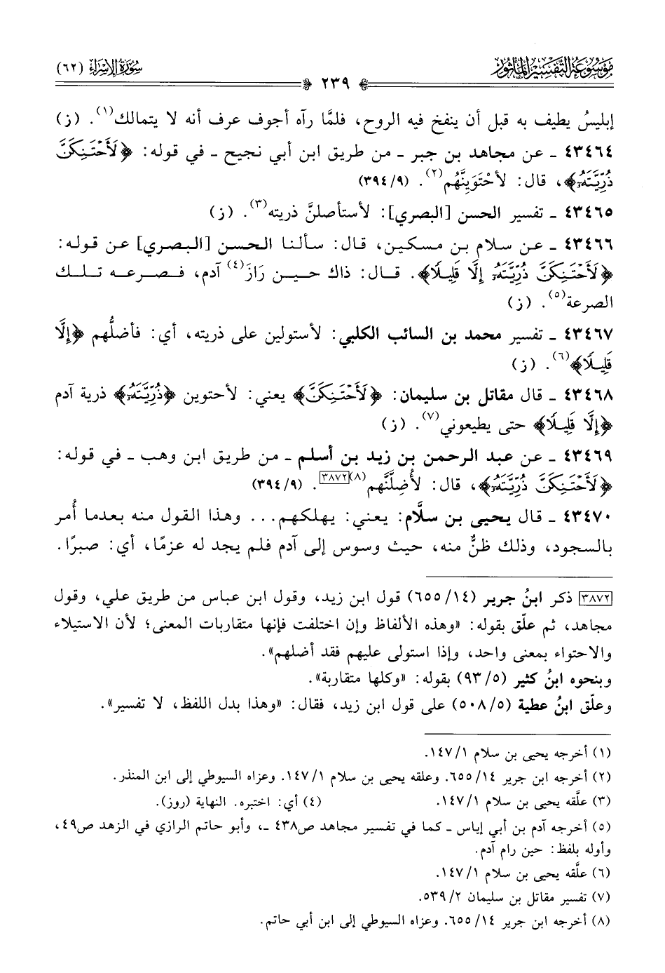 ٤٣٤٦٤ - عن مجاهد بن جبر -من طريق ابن أبي نجيح- في قوله: {لأحتنكَنَّ ذُريَّتهُ}، قال: لأحْتَوَيِنَّهُم (¬٢). (٩/ ٣٩٤)
